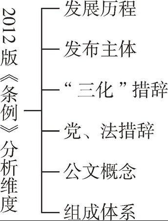 把2012版《条例》及其配套《格式》作为一个系统来研究,同时结合1996版《条例》、2000版《办法》及其配套《格式》进行比较研究,我们可以看到,公文处理工作纲领性文件主要是由六大部分组成,包括:(1)概念体系;(2)责任体系;(3)流程体系;(4)管理体系;(5)格式体系;(6)质量体系。不断建立健全这六大体系,是推进党政机关公文处理工作科学化、制度化、规范化的必然要求和主要内容。