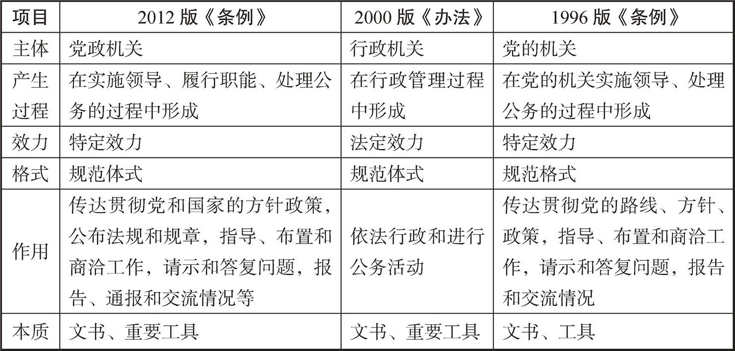 1996版《条例》、2000版《办法》对中国共产党的机关、国家行政机关的公文概念界定的本质差异,集中体现在“特定效力”与“法定效力”上。1996版《条例》关于“特定效力”的措辞与2000版《办法》关于“法定效力”的措辞相互独立,互不涵盖,互不支持,“特定效力”意味着党的机关公文是不承担法律责任的,“法定效力”意味着行政机关公文必须承担法律责任。党的机关公文如有不妥,通过党的内部机制予以纠正,不能作为被告或复议对象,而行政机关公文如有不妥,就有可能被告或复议。