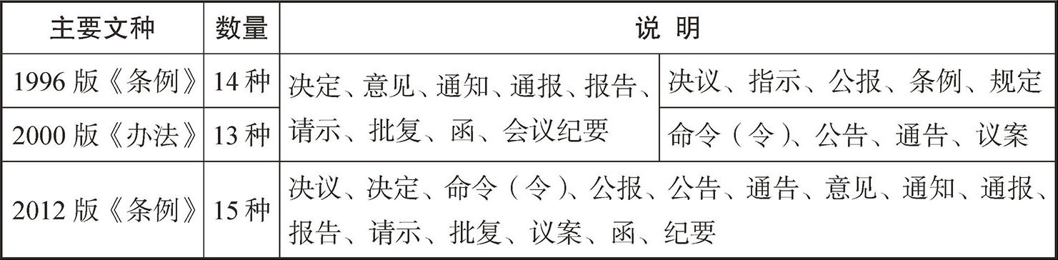 1996版《条例》、2000版《办法》、2012版《条例》分别对党的机关公文文种、国家行政机关公文文种和党政机关公文文种进行了界定。如表1-3所示: