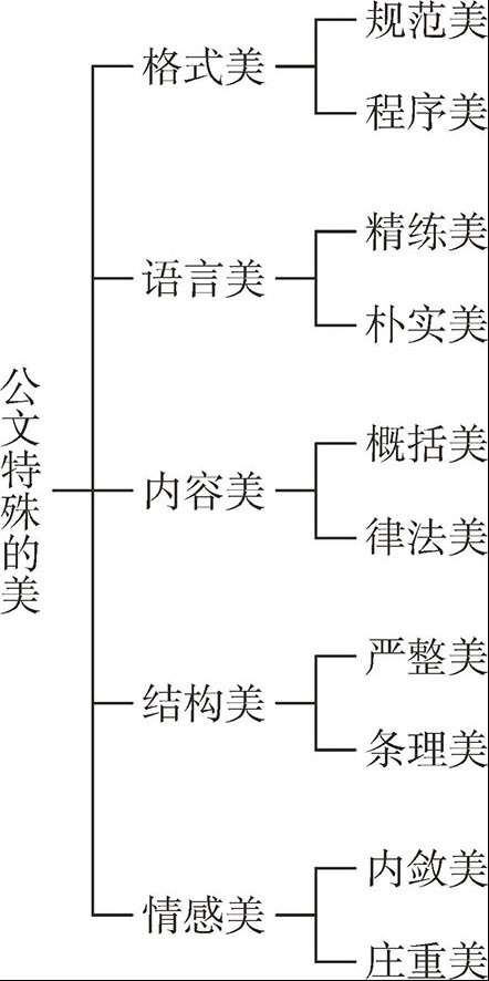 公文是人类语言创造物中实用美和艺术美高度统一的典范。 公文特殊的美,集中表现在格式美、语言美、内容美、结构美和情感美等方面。所谓格式美,集中表现为规范美与程序美。所谓语言美,集中表现为精练美与朴实美。所谓内容美,集中表现为概括美与律法美。所谓结构美,集中表现为严整美与条理美。所谓情感美,集中表现为内敛美与庄重美。一般认为公文无所谓美与不美的问题,这实际上既是对美也是对公文的一种误解甚至偏见。应该说,公文美不美,反映的是对公文价值的认识问题。所谓价值,如马克思所说,“是表示物的对人有用或使人愉快等等的属性”。文章是一种特殊的物,其写作过程是人以语言符号为基本工具表情达意的精神生产活动,公文处理过程的特殊性在于它所承担的社会责任的特殊性,即处理公文是为了满足国家治理的需要,实现特定利益目标,其传达的公务信息发挥着领导指导、准绳规范、联系沟通、宣传教育、商洽协调以及凭证依据等作用,直接作用于日常思想、工作和生活,具有广泛的社会实用价值,因此 公文承担的社会责任是所有文章中最重、最高、最深刻、最权威而且最广泛的 。我们在前面已经谈到,具有直接的法定作用价值,这是公文的价值所在,也是公文区别于其他体裁的文章(特别是文艺作品)最重要的价值特征。当我们由衷地赞叹某篇公文“写得真好”“干得真漂亮”的时候,实际上暗含了一个命题,即公文的实用价值和它的审美价值具有直接的同一性,而公文作者、受众首先感受和第一关注的是其实用价值。这就决定了公文的美与文艺作品的美具有明显不同。任何一种实用目的都可能成为文艺作品的创作动机之一,而且其艺术价值即使在实用动机未能实现的情景下仍然能够相对独立地存在,也就是说对于文艺作品而言,其艺术魅力要比实用动机的成败宽广得多,或者说文艺作品解读的效果是实用性客观上为审美性服务,文艺作品审美性与读者自身及其所代表的现实功利性之间的距离是其审美价值得以存在和变化的前提,这就解释了为什么“一千个读者有一千个哈姆雷特”的艺术谜题。但是,公文却不可能也不能如此,它必须首先使自己所具有的实用价值达到最大化,在此过程中散发出美的光辉,从而更好地推动实用价值的最大化,也就是说 公文的审美性是为实用性服务的 ,即公文的实用价值和它的审美价值所具有的直接同一性程度越高,越让人感到美不胜收。