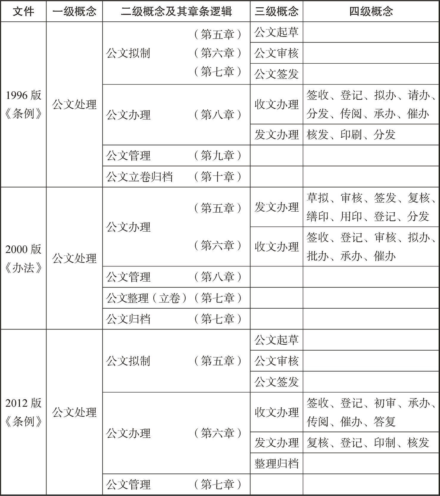 这些概念构成了公文处理的概念体系,与1996版《条例》、2000版《办法》的有关规定比较如下: