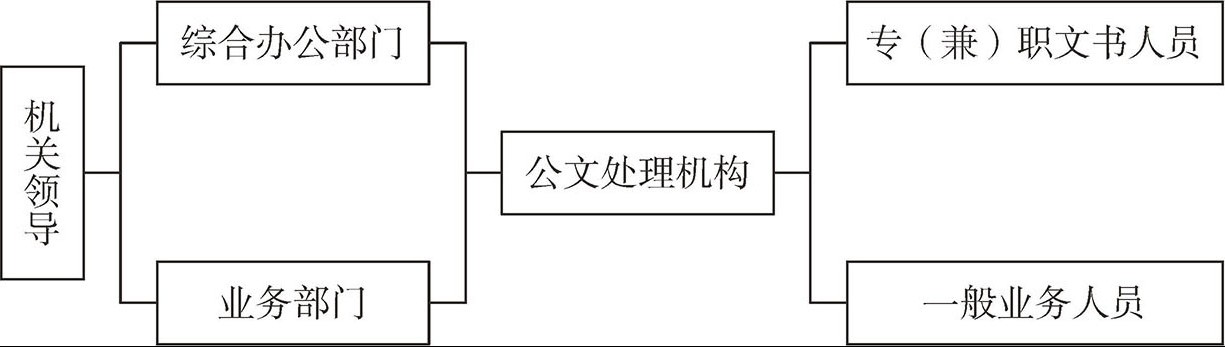 公文处理机构又称文书部门或专职文秘机构,它是在综合办公部门或业务部门内部下属的专门承担(或主要承担)公文处理任务的组织,具体称谓有多种,如文书处(科、室)、文电处(科、室)、秘书处(科、室)、核文处(科、室)、机要处(科、室)等。这类机构负责人在公文处理中的主要责任是:(1)草拟由领导交办的公文;(2)审核公文;(3)拟办、承办部分公文;(4)具体协调解决机关内部、外部有关公文处理的一般性具体矛盾关系;(5)具体组织控制各部门公文的流程;(6)以多种渠道了解公文处理的具体情况,直接指导解决或提请领导解决有关具体问题;(7)根据授权提出公文处理工作的计划及实施方案,设计公文处理的制度、标准和规程,规划公文处理流程;(8)具体指导下级机关的公文处理工作。