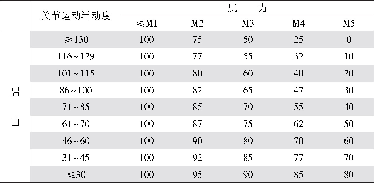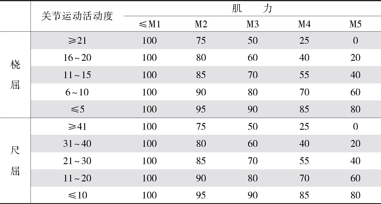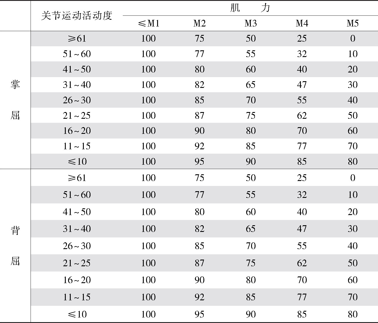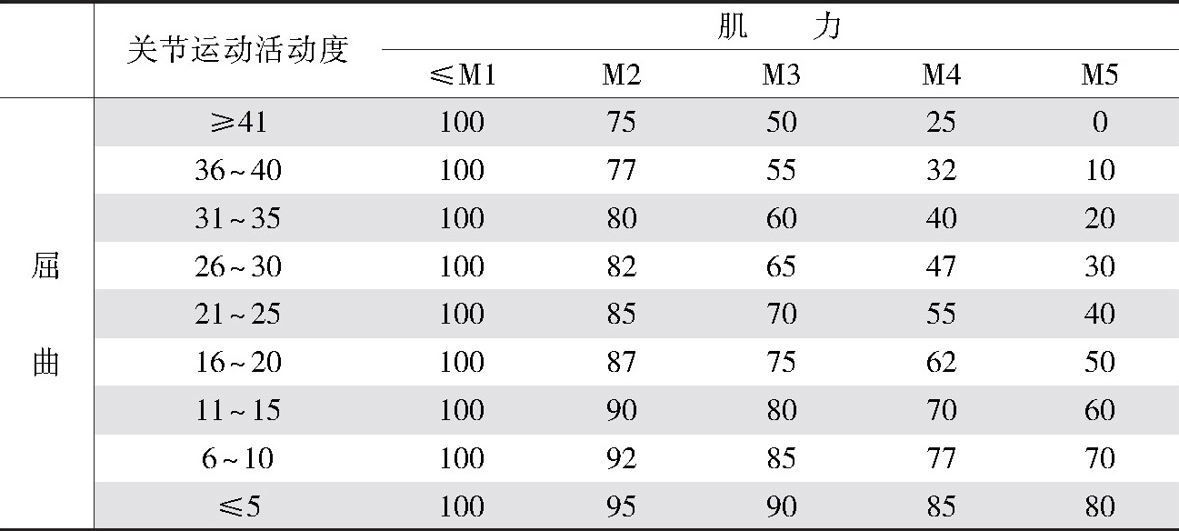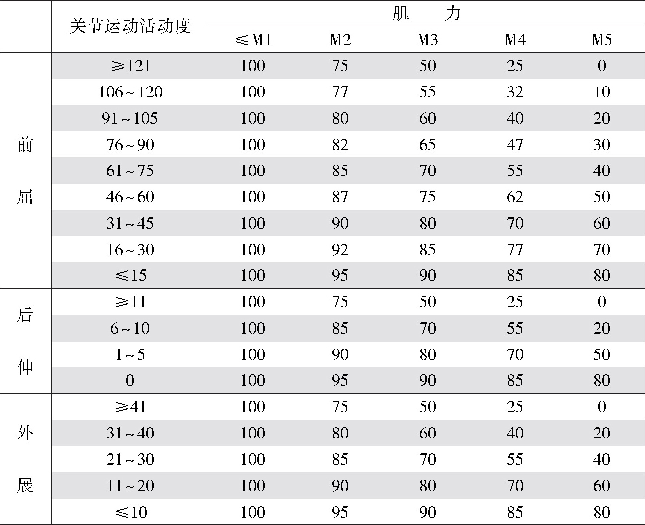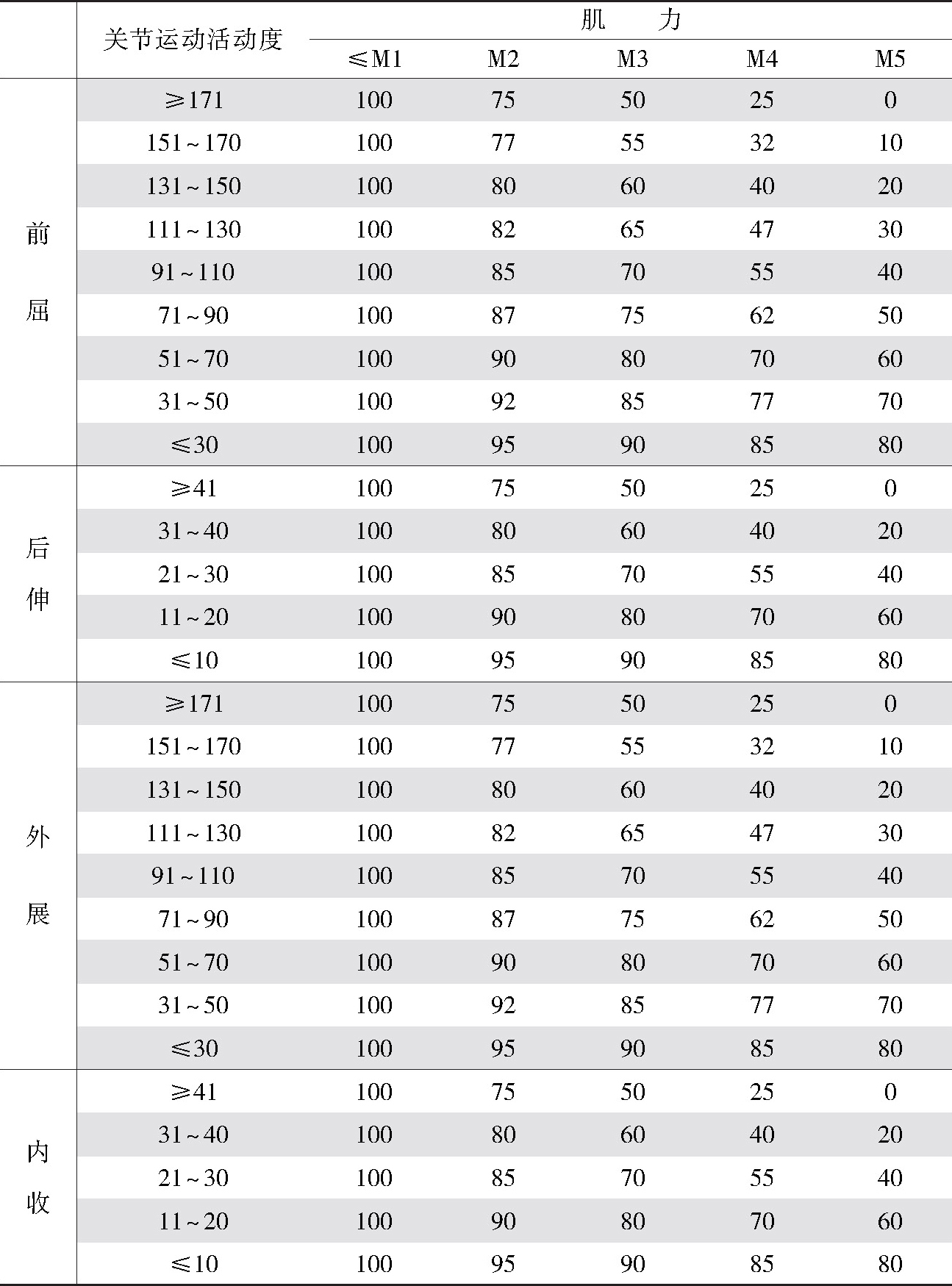 先根据受损关节活动度大小及关节肌群肌力等级直接查表(见表C-4~表C-9)得出受损关节各方位功能丧失值,再将受损关节各方位功能丧失值累计求和后除以该关节活动方位数(如肩关节活动方位为6)即可得出受损关节功能丧失值。