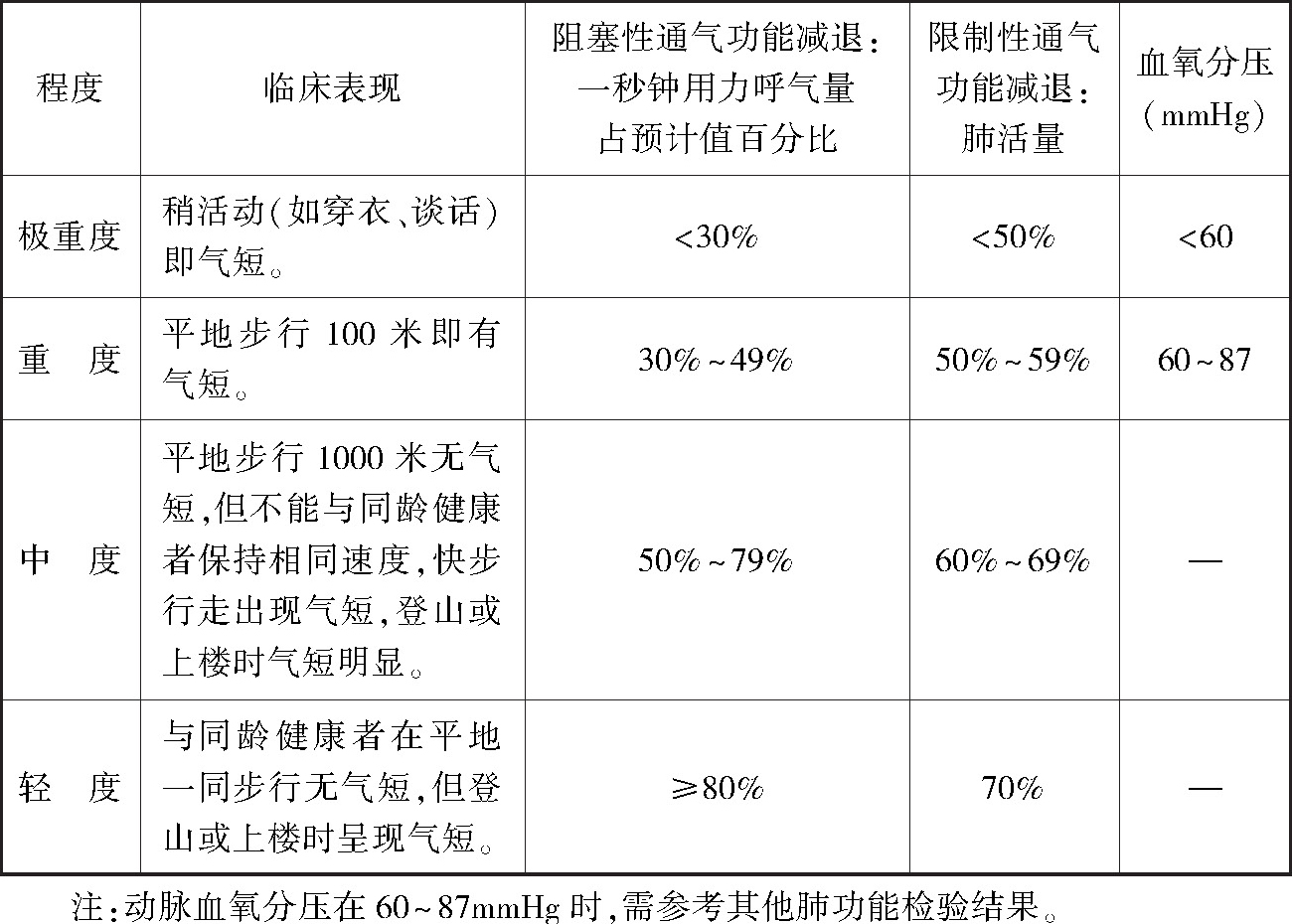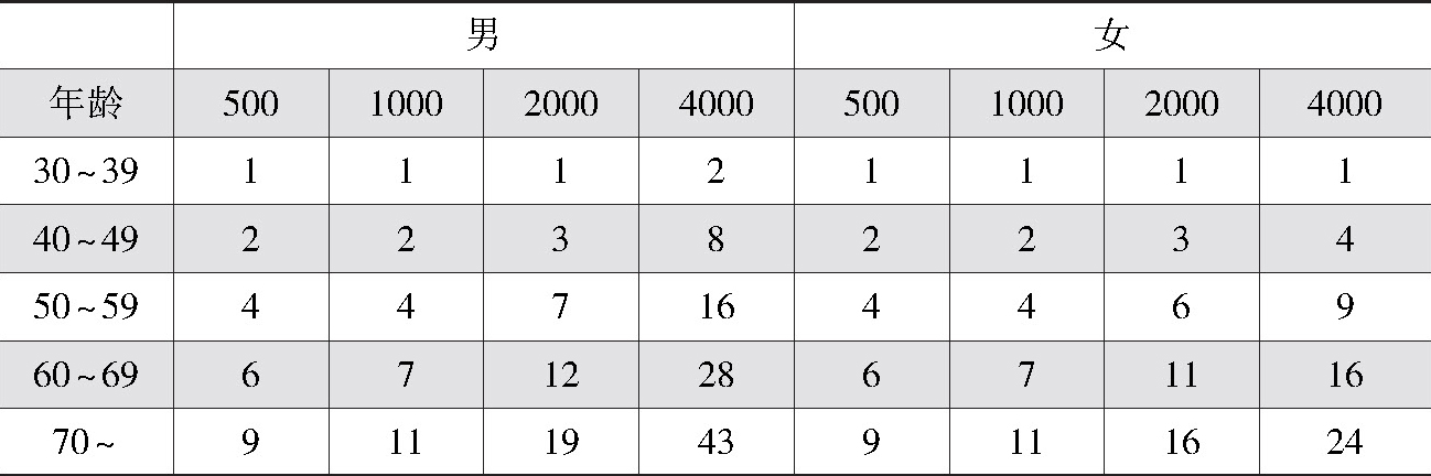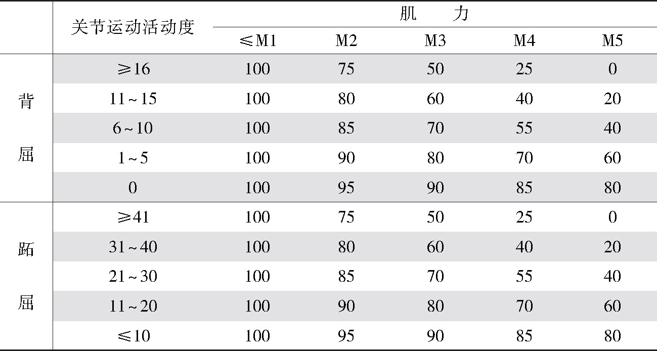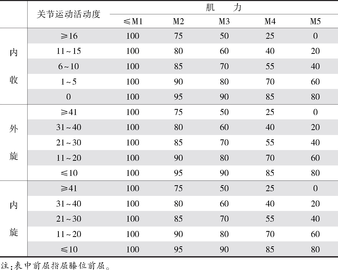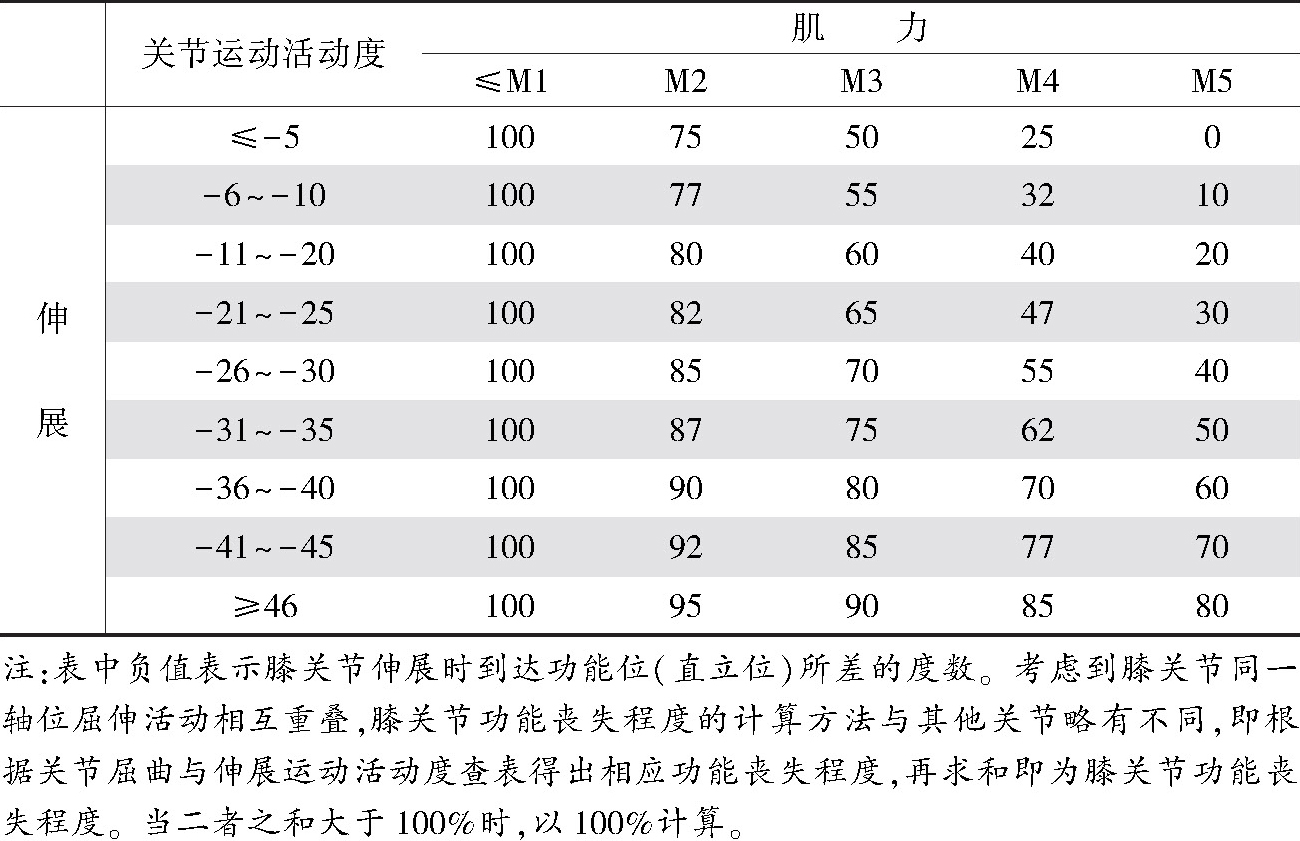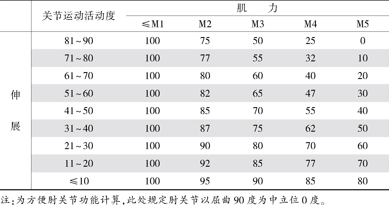 先根据受损关节活动度大小及关节肌群肌力等级直接查表(见表C-4~表C-9)得出受损关节各方位功能丧失值,再将受损关节各方位功能丧失值累计求和后除以该关节活动方位数(如肩关节活动方位为6)即可得出受损关节功能丧失值。