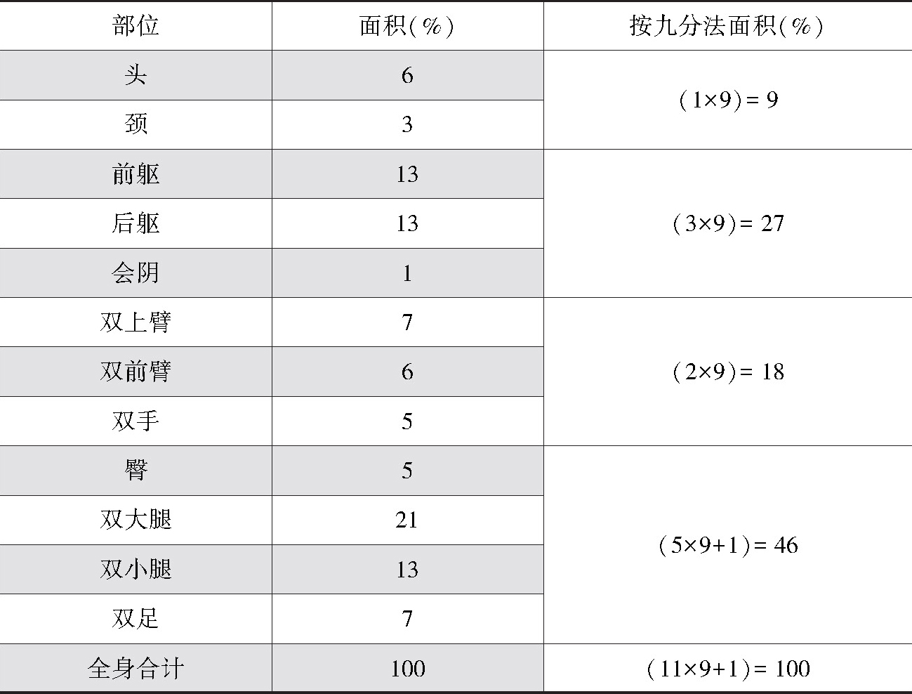 注:12岁以下儿童体表面积:头颈部%=[9+(12-年龄)]%,双下肢%=[46-(12-年龄)]%。