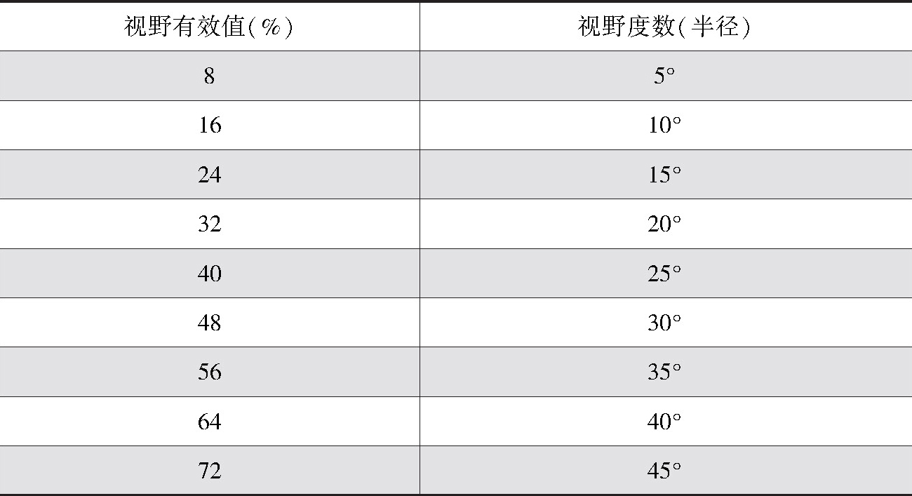 3)双眼视野接近完全缺损,视野有效值≤4%(直径≤5°);