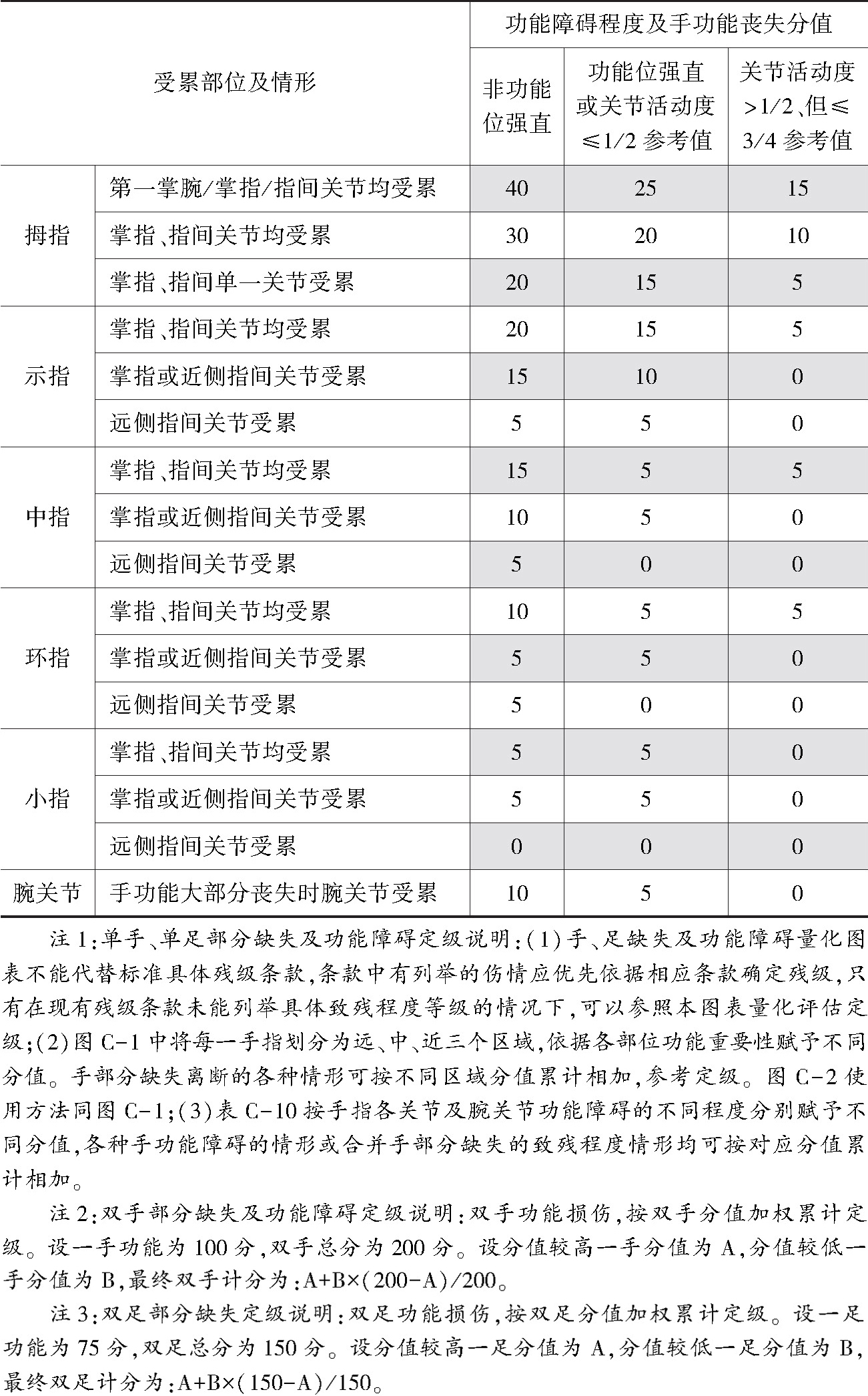 表C-10 手指关节功能障碍相当于手功能丧失分值的评定