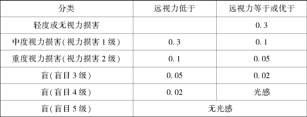 1)一眼球缺失、萎缩或者盲目5级,另一眼盲目3级;