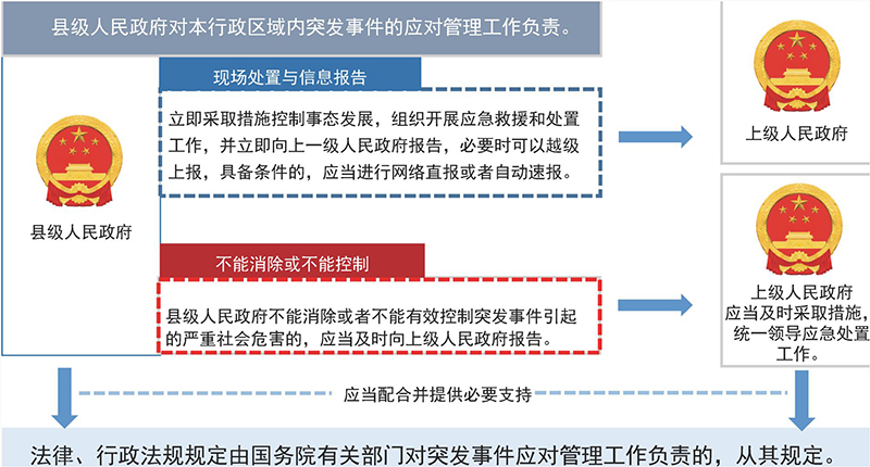 县级人民政府对本行政区域内突发事件的应对管理工作负责。突发事件发生后,发生地县级人民政府应当立即采取措施控制事态发展,组织开展应急救援和处置工作,并立即向上一级人民政府报告,必要时可以越级上报,具备条件的,应当进行网络直报或者自动速报。