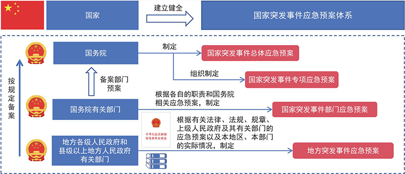 国务院制定国家突发事件总体应急预案,组织制定国家突发事件专项应急预案;国务院有关部门根据各自的职责和国务院相关应急预案,制定国家突发事件部门应急预案并报国务院备案。