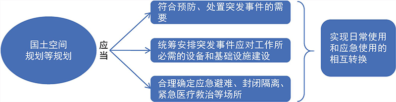 国土空间规划 等规划应当符合预防、处置突发事件的需要,统筹安排突发事件应对工作所必需的设备和基础设施建设,合理确定应急避难、封闭隔离、紧急医疗救治等场所,实现日常使用和应急使用的相互转换。 PO1lZ4cnlaJB0X93FwdviCHtP43IOG+B4DYY9nqbgm6ImOumDTWO1NJ/LlHLpTCY