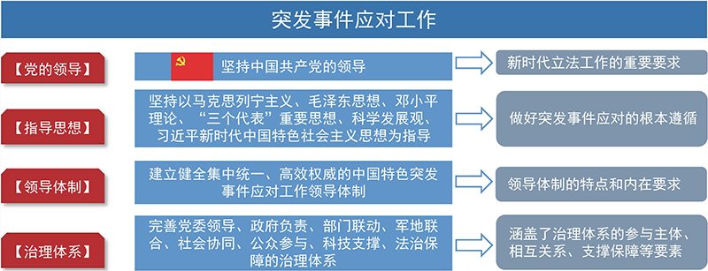 突发事件应对工作坚持中国共产党的领导 ,坚持以马克思列宁主义、毛泽东思想、邓小平理论、“三个代表”重要思想、科学发展观、习近平新时代中国特色社会主义思想为指导 ,建立健全集中统一、高效权威 的中国特色突发事件应对工作领导体制,完善党委领导、政府负责、部门联动、军地联合、社会协同、公众参与、科技支撑、法治保障 的治理体系。 PO1lZ4cnlaJB0X93FwdviCHtP43IOG+B4DYY9nqbgm6ImOumDTWO1NJ/LlHLpTCY