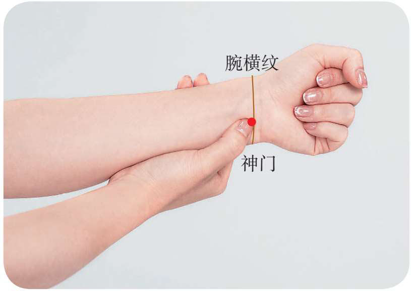快速取穴: 首先找到手掌与手臂连接的横纹(腕横纹),在靠近小指的一侧,可以摸到一条明显的肌腱(尺侧腕屈肌腱),这条肌腱的桡侧(即靠近大拇指的一侧),可以找到一个明显的凹陷处,即为神门