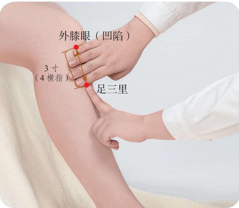 快速取穴: 坐位屈膝,取犊鼻穴(外膝眼),自犊鼻穴向下量 4横指(即 3寸),按压有酸胀感