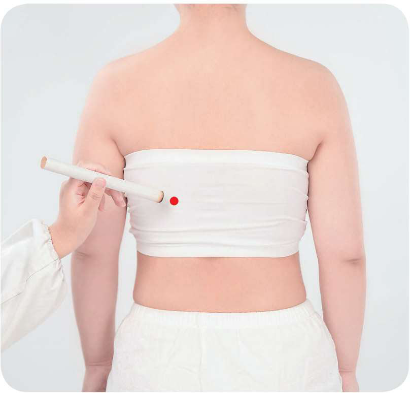快速取穴: 直立位,双手下垂,肩胛骨下角水平连线与脊柱相交椎体处,往下推 2个椎体,下缘旁开 2横指处即是