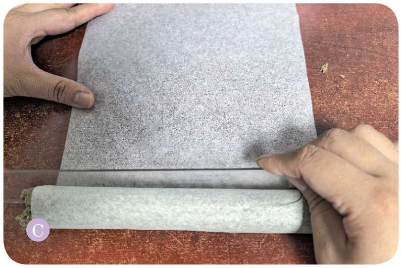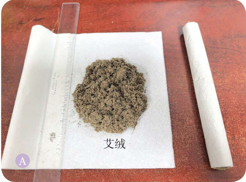 取纯棉纸或桑皮纸一张,裁剪成宽约 25厘米,长约 40厘米的长方形,将艾绒均匀地铺在纸的一端,从这一端紧紧地卷起,过程中可借助尺或竹板等工具,并在末端涂上糯米胶固定,完成长 25厘米、直径 1.5厘米艾条的制作。注意卷制过程要用力均匀,艾条要紧实饱满,这样做出来的艾条在使用过程中燃烧缓慢,火力均匀柔和。