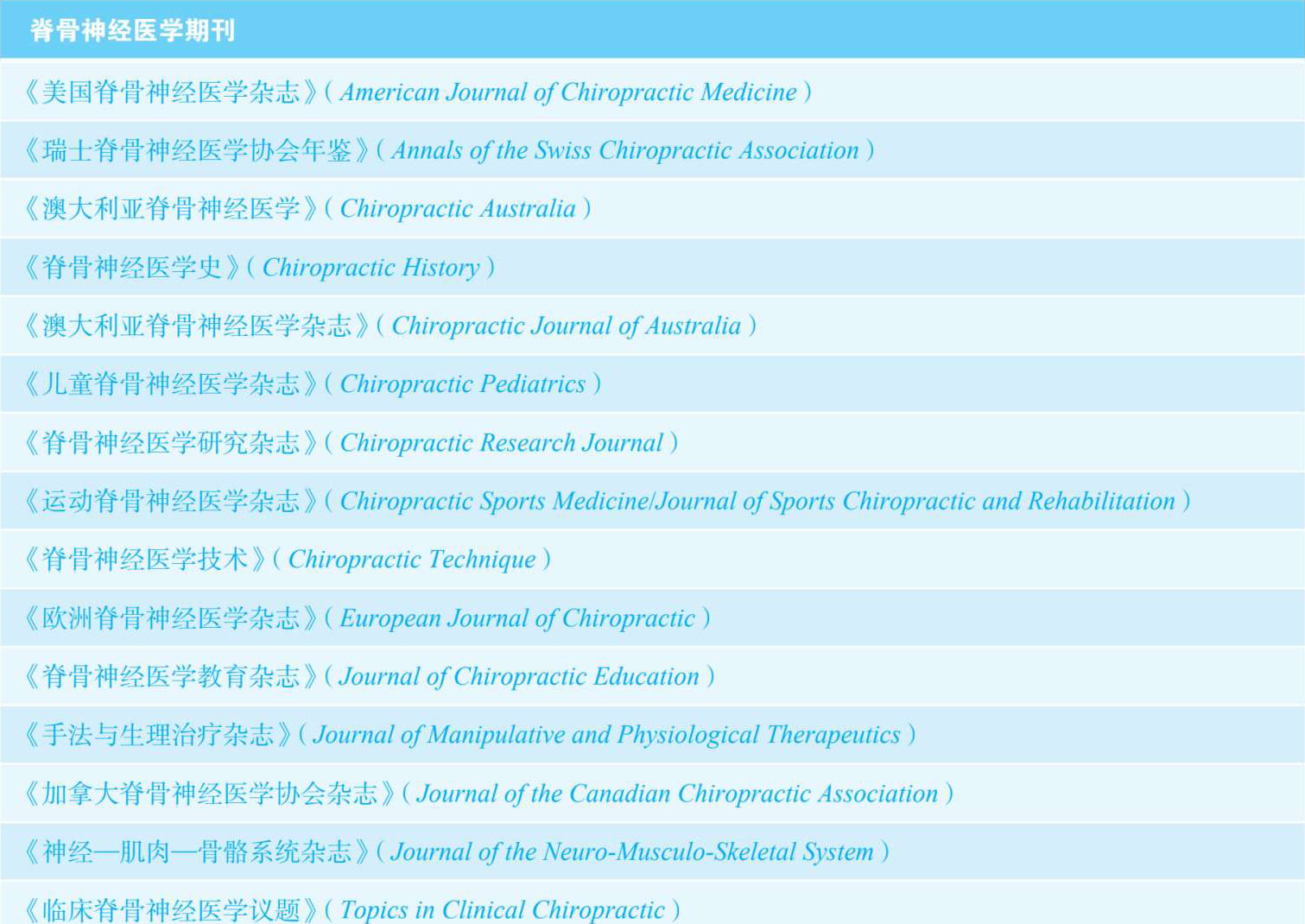 短短几年后,其他脊骨神经医学期刊也相继创刊出版,涵盖不同的学科、国家和疗法。表 2-1列举了这一时期创刊的部分脊骨神经医学期刊。