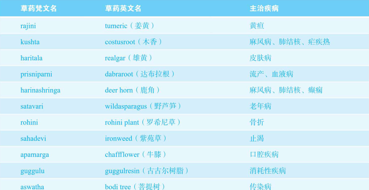 以下是《吠陀经》中提及的疾病梵语名,括号内用中文标注了对应疾病名:jwara [takma(发热)]、kasa(咳嗽)、balasa(消瘦性疾病)、apachi(软组织肿胀)、jayanya(消耗性疾病)、harima(黄疸病)、mutrarodha(尿路梗阻)、kilasa(白皮病)、visuchi(霍乱)和unmada(精神病)。