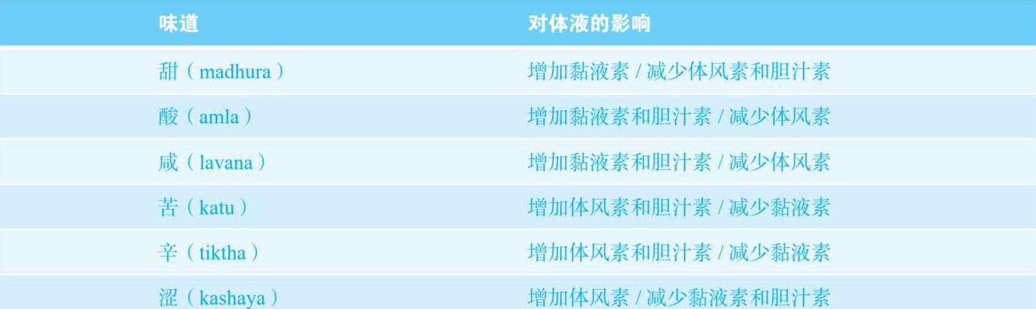 其他比如味觉这样的属性,会对一个人的体液、身体组织、排泄物以及消化之火产生重大影响。阿育吠陀详细解释了六种味道。表 1-3 列出了六味对三种体液所产生的效果。
