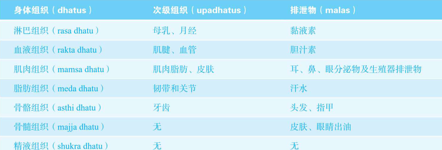 身体组织(dhatus)是指身体中的七种基本组织,包括血浆/淋巴(rasa)、血液(rakta)、肌肉(mamsa)、脂肪组织(meda)、骨骼或骨组织(asthi)、骨髓/神经组织(majja)以及生殖组织(shukra)。“dhatu”一词的意思是“辅助身体的或身体基本构造的东西”。身体的主要结构(尤其是各个器官)都是由这七种身体组织和七种次级组织(updhatus)按不同比例构成的。一旦身体组织的比例或原本正常的平衡状态发生变化,就会引发疾病。只要这七种身体组织的产生和营养处于正常的状态,人就能保持健康。