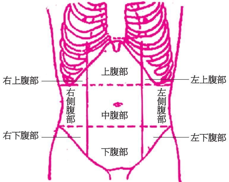 腹痛的原因非常复杂,不是很容易就能明确诊断。在临床医学上甚至都有专门的一门学科叫“急腹症学”。因此在判断腹痛病因时,首先要弄清楚腹部疼痛的部位和器官的关系。医生把腹部划分为左、右上腹部、左、右下腹部、左、右腹部及上腹、中腹和下腹部(见下图)。每个分区里有众多不同的器官,所以腹痛可不止“胃痛”一种。