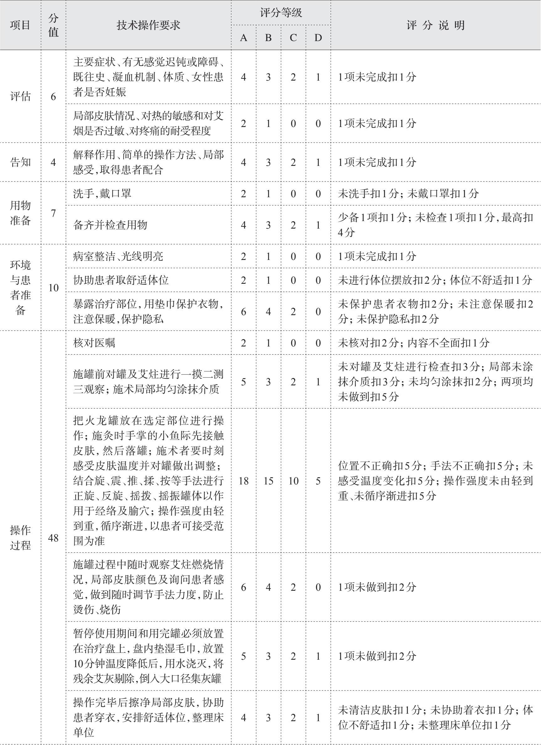 11.施罐过程中随时观察艾炷燃烧情况,局部皮肤颜色及询问患者感觉,做到随时调节手法力度,防止烫伤、烧伤,操作结束后再次清洁局部皮肤。