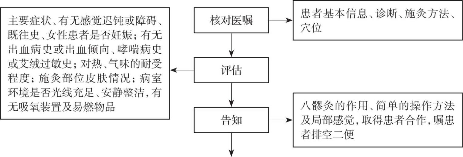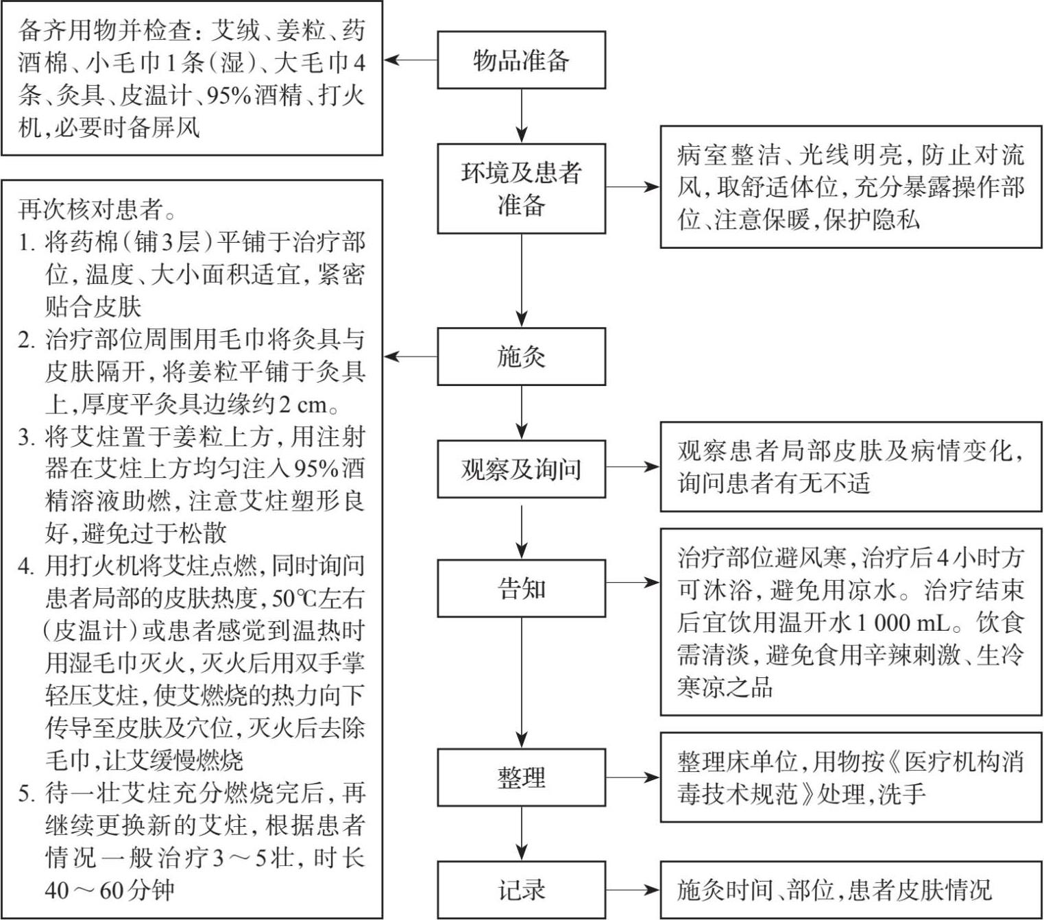 艾绒、姜粒、药酒棉、小毛巾1条(湿),大毛巾4条、灸具、皮温计、95%酒精、打火机,必要时备屏风。
