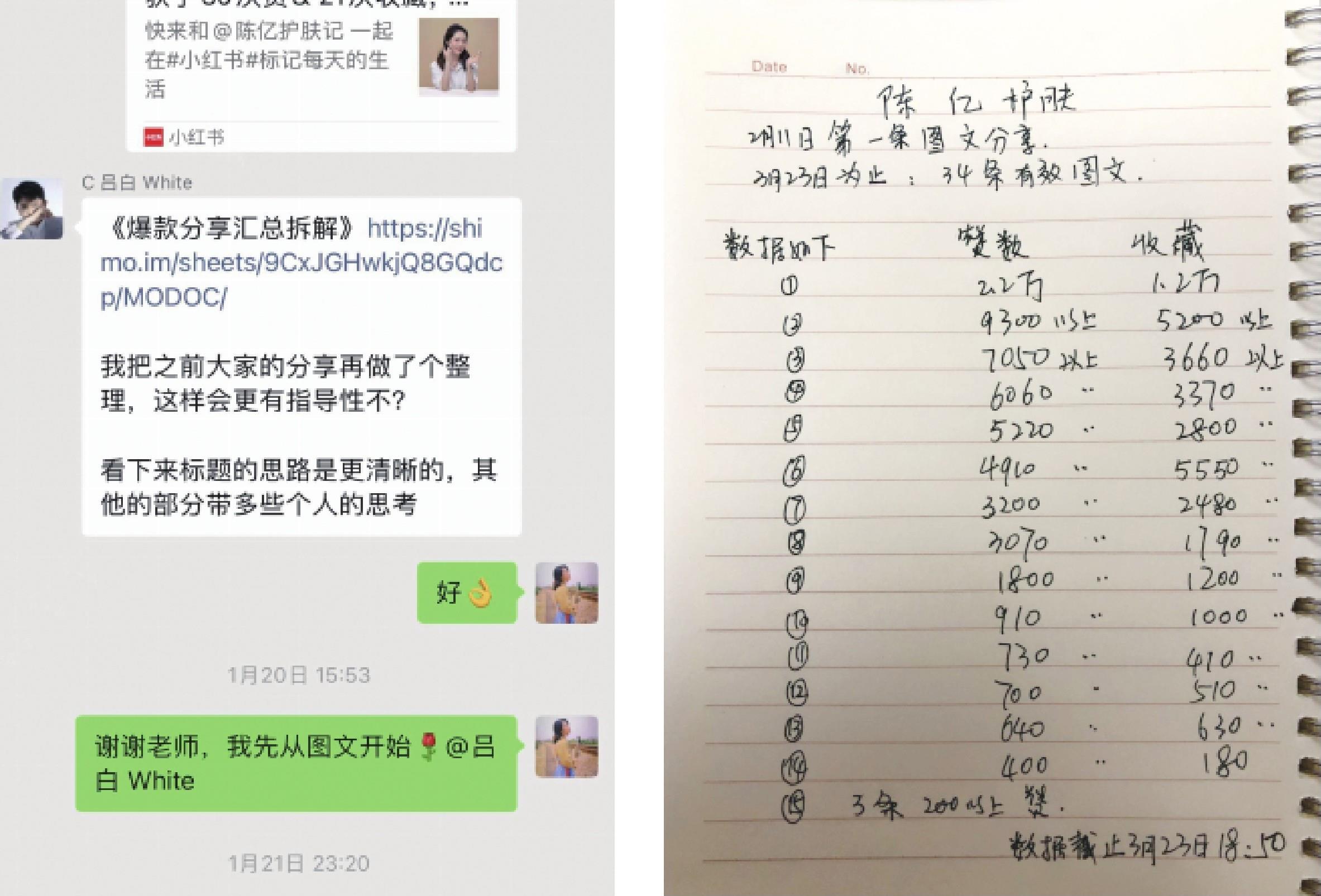 和她情况相反的是另外一个学员 @陈亿护肤 。她在找我报名之前,全部都是做视频内容,因为当时视频在小红书算是一种发展趋势,但可惜的是,她做了一年也没有做起来。看了她的账号后,我发现她的定位以及图文审美都没啥问题,但是因为普通话不标准,而且上镜神态不自然,视频这种形式对她来说有点难度,所以我建议她改做图文方向。做图文后她发现在这方面非常有天赋,后续相继有了多条爆款笔记,下面的数据图就是她在社群分享经验时展示的。