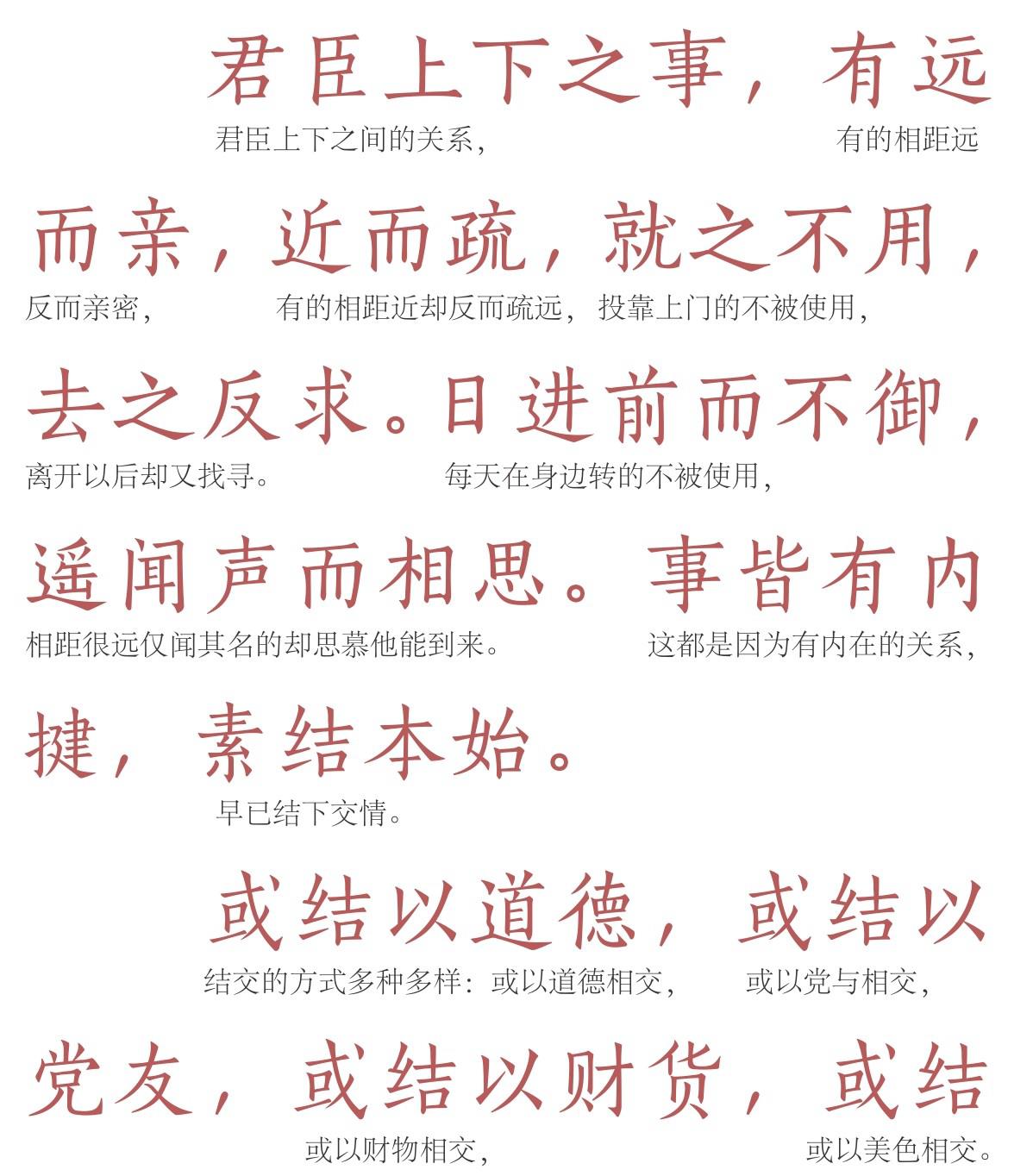 首先列举君臣关系存在的三种情况:一是远而亲,近而疏。君与臣或上级与下级之间相处较远,关系本应疏远,实际却很亲密;相处较近的,关系本应亲近,实际却很疏远。二是就之不用,去之反求。臣下积极主动去投靠君上,为君上效劳的,反而得不到任用;离去之后,反而想找来重用。三是“日进前而不御,遥闻声而相思”。君上对每天在眼前听候差遣的人不加重用,却对只闻其名的人思慕不已,希望能得到他,重用他。这是君臣之间似乎违背常理却实际存在的现象,其存在的原因是结交的关系程度不同,时间有长短之分,即“事皆有内揵,素结本始”。