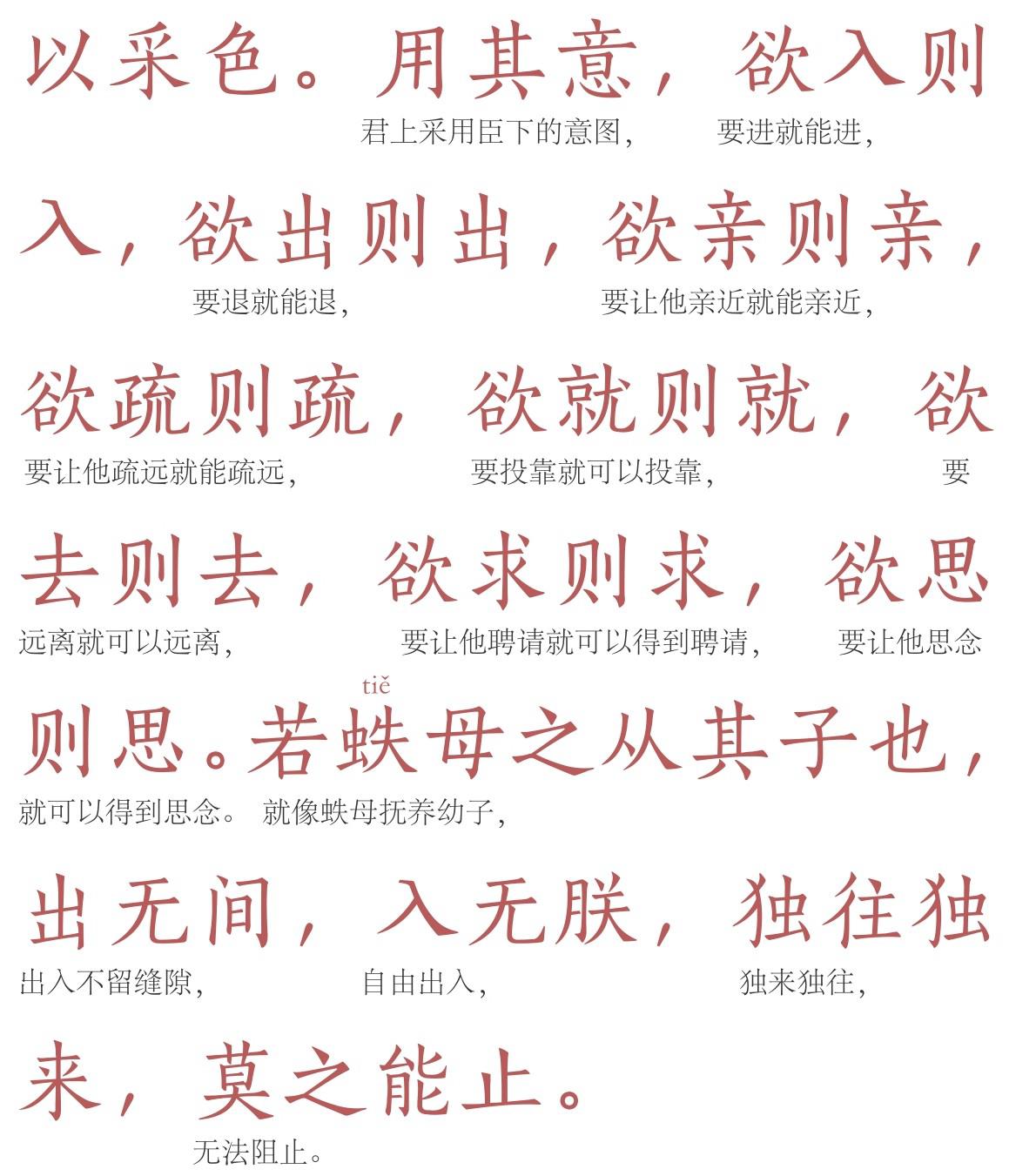 接下来阐述了实施内揵之术的具体方法,要根据不同的对象、不同的情况,采用不同的方式。有的可以用道德相交结,有的可以用党友相交结,有的可以用财物相交结,有的可以用珍玩美色相交结。无论用何种方式,都要顺应对方的意愿,即所谓“用其意”,俗语中所说的顺摸老虎毛。运用得当,可以达到“欲入则入,欲出则出,欲亲则亲,欲疏则疏,欲就则就,欲去则去,欲求则求,欲思则思”进退自如、随心所欲的理想境界,使君上像蛈母离不开幼子那样离不开自己,没有空子让对手可钻。