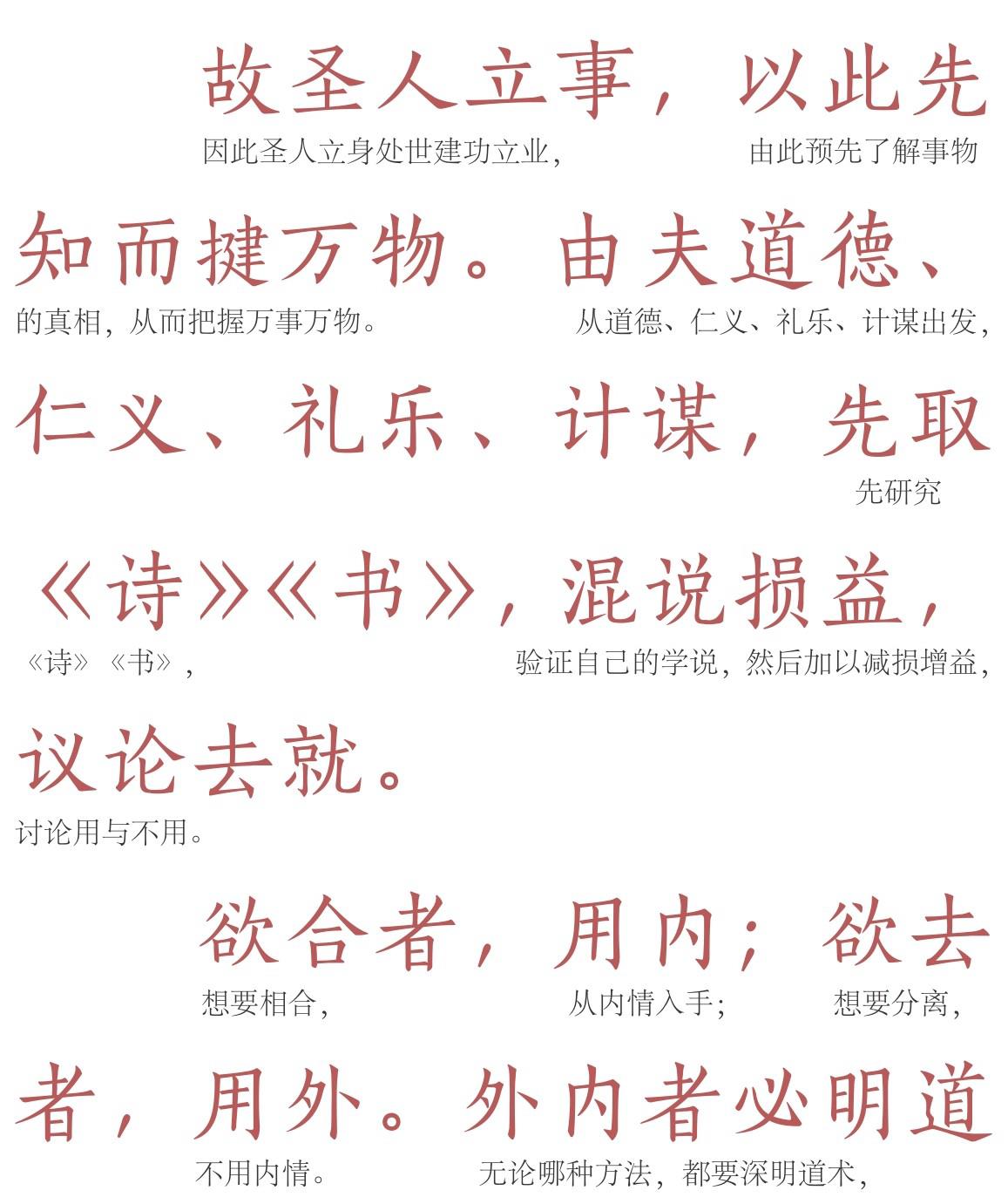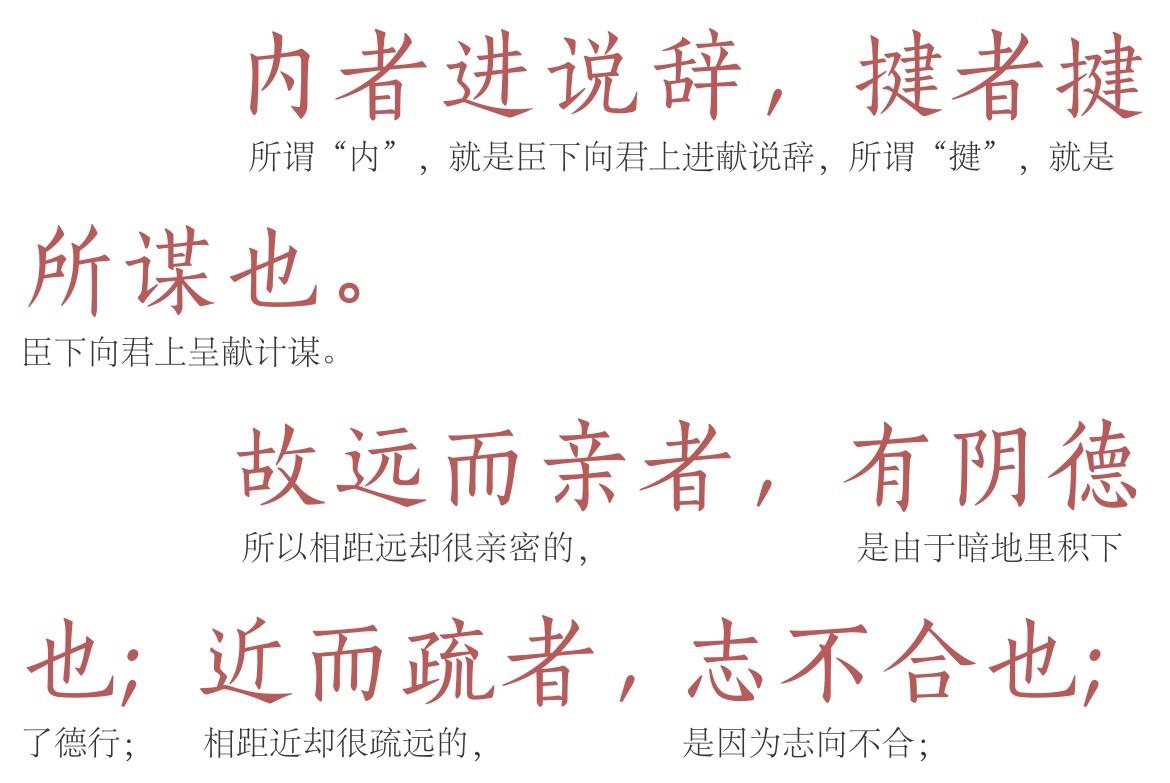 陶弘景在注中作了进一步说明:“道合则‘远而亲’,情乖则‘近而疏’;非其意则‘就之’而‘不用’,顺其事则‘去之’而‘反求’;分违则‘日进前而不御’,理契则‘遥闻声而相思’。”志同道合、顺事合理,就亲而重用;道背情乖、意逆理违,就疏远而不用。