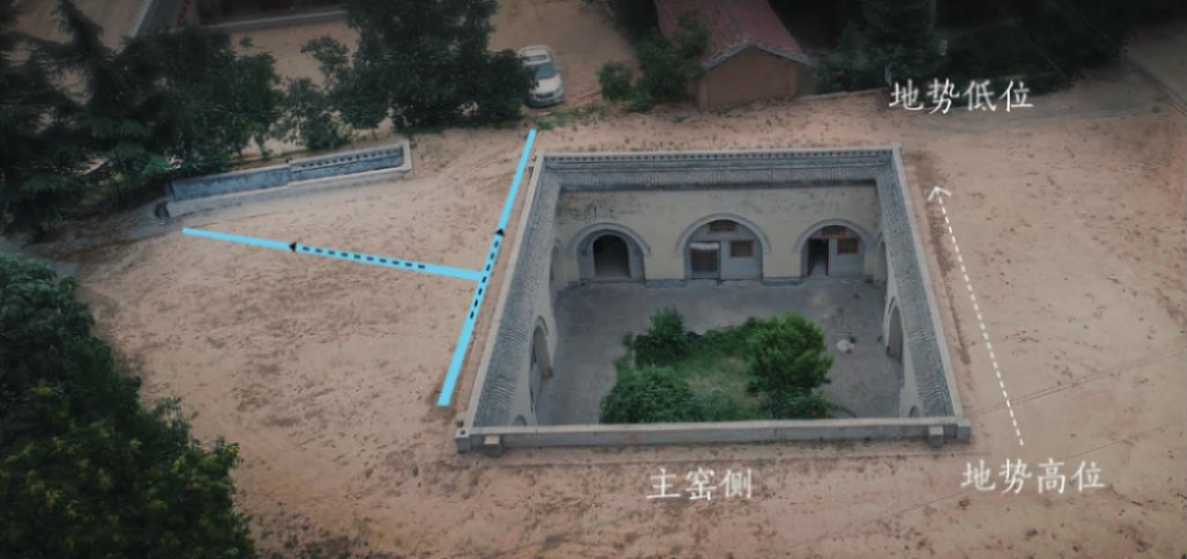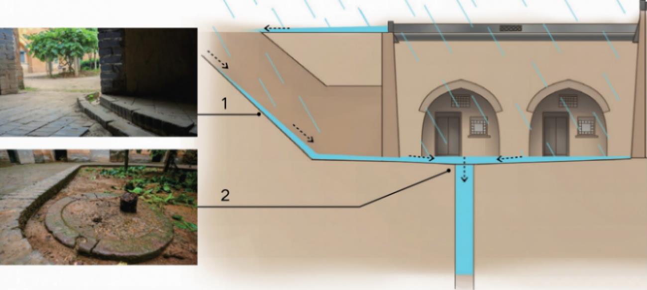 首先,通过塑造地表的高低坡度快速排走雨水,减少积水下渗,并引导剩余雨水从门洞的水渠流到方院里的渗坑排走。渗坑就是渗水井,其深度与方院的深度一致。渗坑的工作原理是利用地下黄土层的结构属性,让雨水到达疏松的砂黄土层后被排走,砂黄土层一般在地表下十二米左右。