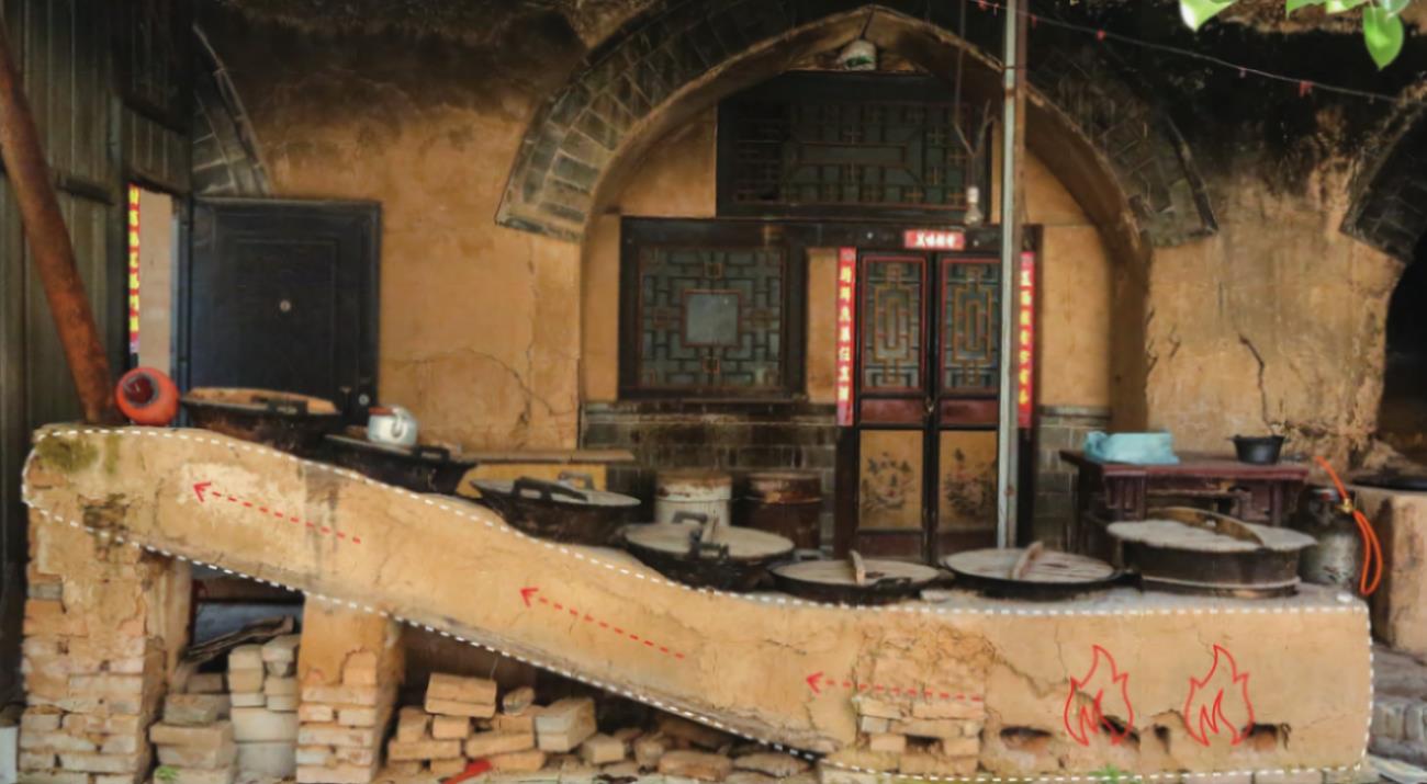 地坑院中升腾的烟火气,也在门面装饰的蜕变中愈发鲜活。每逢重要节日,村里需要大摆筵席时,一些人家便会在院子里搭出一条长形土灶——穿山灶——招待宾客。因为灶心相通,在灶尾添柴烧火,热力向上传递并减弱,就能自然形成多个火候不一的炉灶。炉灶数量最多可达九个。其中,距离灶尾近的炉子火力最旺,适合蒸、煮的烹饪方式。随着火力逐步减弱,不同炉灶依次能够实现炸、炖、焖、保温的功能。几口锅同时操作,就能高效地做出当地的著名菜式“十碗席”。