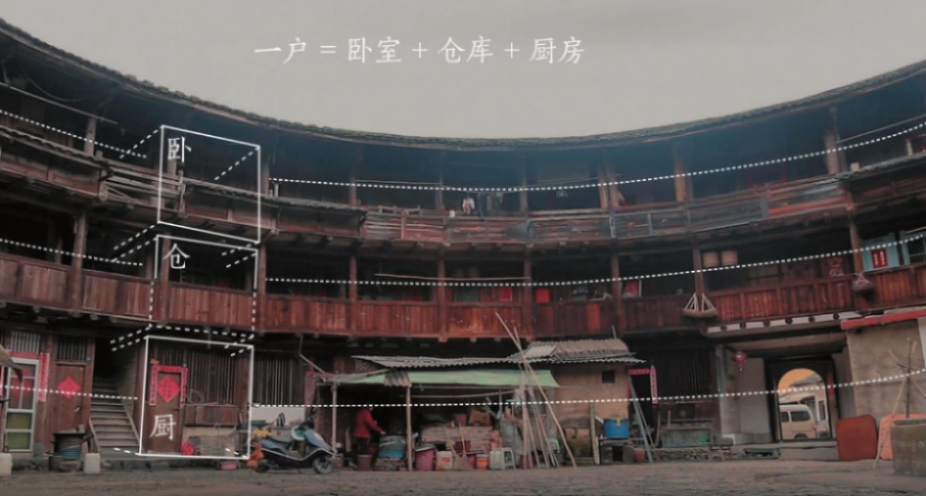 外圈建筑有三层高,分别对应三种功能。一楼是厨房和用餐的地方,包括房间和对应的室外空间;二楼是储存粮食和物品的仓库;三楼房间是休息睡觉的卧室。每户人家至少有一间厨房、一间仓库和一间卧室,而这三个房间是根据家族商议灵活分配的,并非固定在同一竖排里。这就相当于把一个家的三个功能空间拆分到三层楼里,用垂直叠加的方式代替了平层布局。这种设计不仅节省了用地,更从空间上体现了土楼的平均主义。楼内的每个家庭都住在大小、格局相同的房间里,即使身份显贵者也不例外。