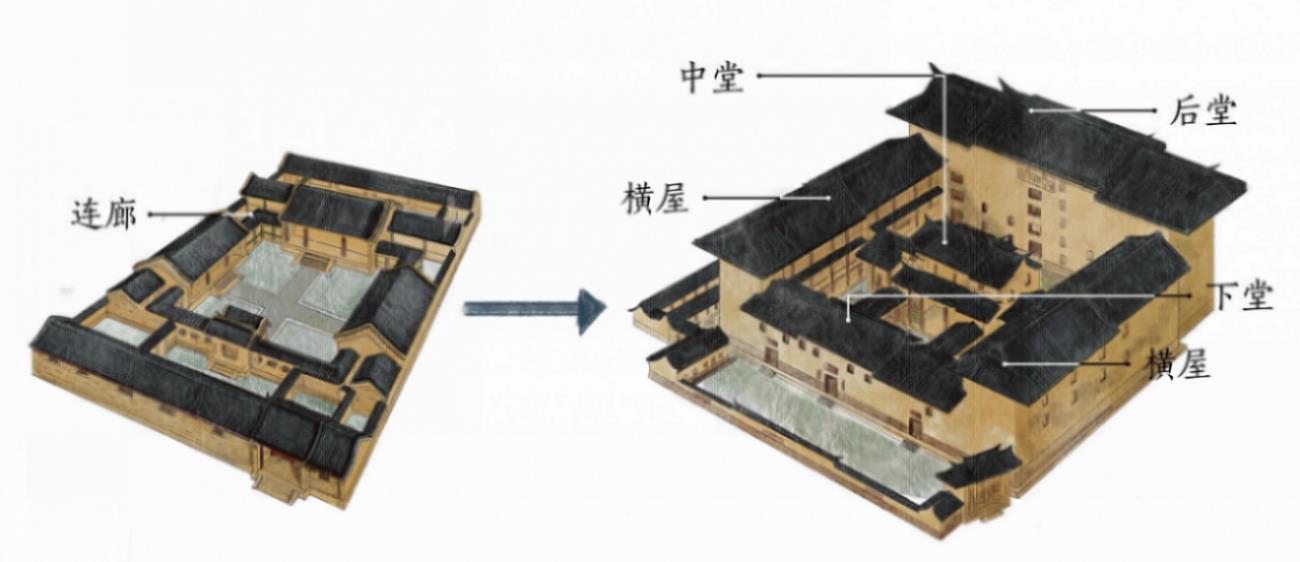 随着院子外围的厢房持续加高、扩建,楼体逐渐代替了围墙,兼具居住和攻防功能。当院子正门也被改为楼体后,五凤楼就此诞生。土楼的第一次升级改造,就是在保留四合院形态的基础上实现了“以居为墙,以墙为居”。