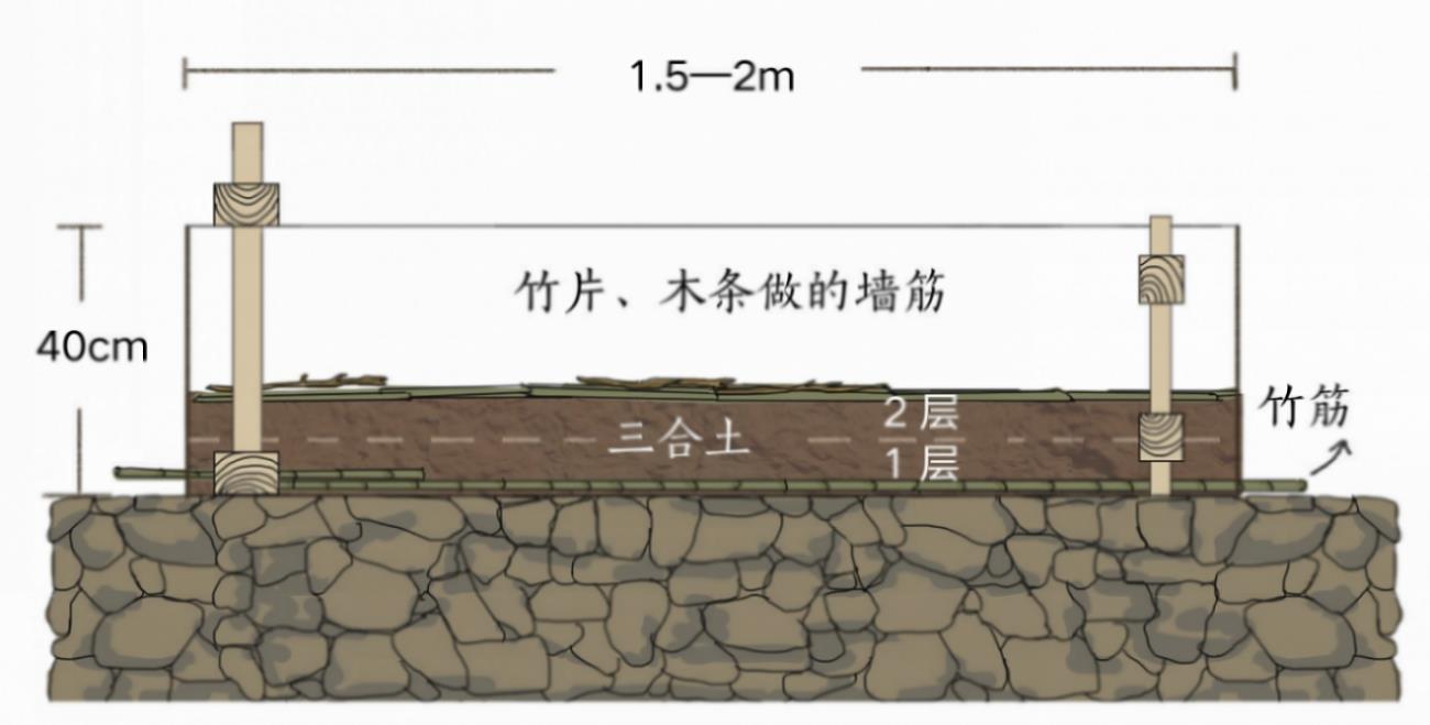 虽然工艺听起来并不复杂,但实际建造的过程中有很多费时耗力的细节。例如,浇筑一版土方块需要分四到五层进行,每两层之间还要加入浸泡过石灰水 的杉木条或竹片作为墙筋,以增强土墙的拉力和韧性。此外,土方块必须一圈一圈垒起来。每圈墙体成形后,要等它自然干燥,工匠修整完表面后才能继续垒下一圈。完整砌成一层楼高(约3.6米)的墙体,需要走完八圈,花费一年时间。