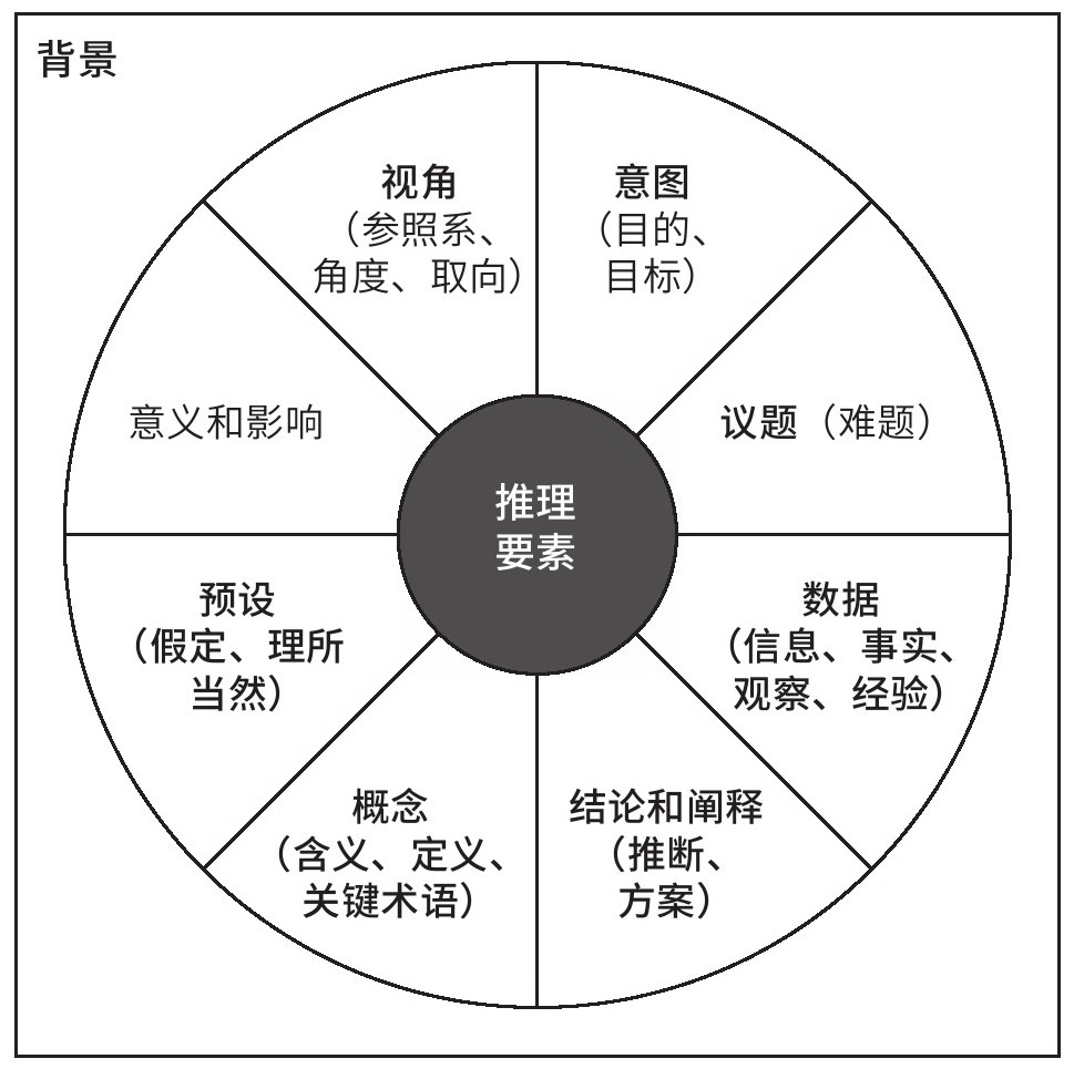 本书有八个推理要素,参见下面的环形图。这八个要素阐明了推理步骤的组成部分。用“部分”这个词意味着,你在推理、思考、弄明白某事时,已经在思考这八个部分。