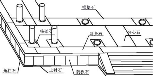 普通台基陡板石台明的构造,自下而上,一般由土衬石、角柱石、陡板石、阶条石、柱础石等组成(图 1-9)。