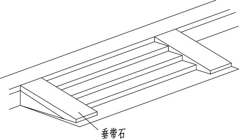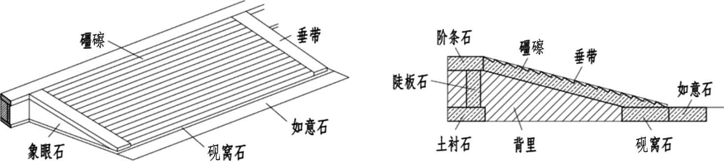 坡道古称“礓(jiāng)䃰(cā)”,礓䃰一般不用御路石,但必须用垂带石,具体构造见图 1-15。
