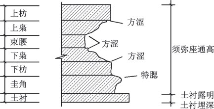 须弥座是一种上下凸出、中间凹陷的台基基座,自下而上,一般分为土衬、圭角、下枋、下枭、束腰、上枭、上枋等(图 1-10、图 1-11)。