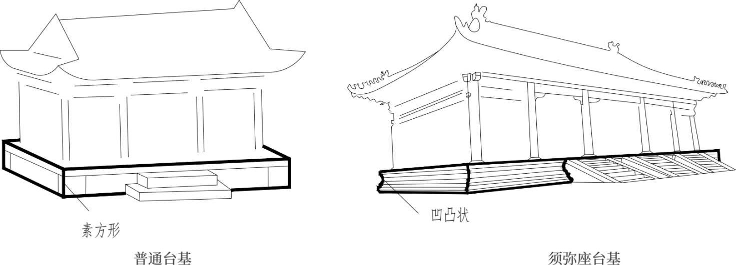 台基按形式分类,主要分为普通台基和须弥座台基。普通台基多为素方形,须弥座台基侧面呈凹凸状(图 1-7)。