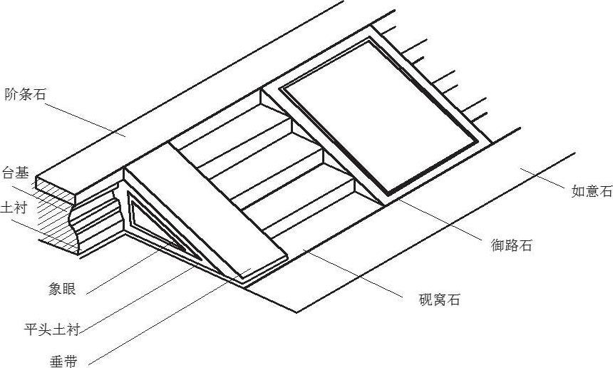 台阶主要由平头土衬、如意石、砚窝石、垂带石、象眼石、御路石、阶条石等组成(图 1-14)。