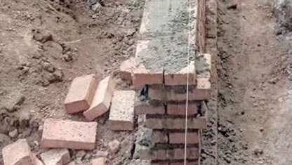 ❸ 土衬石铺装 ——从基准点引出水平点,设置皮数杆,拉线控制标高