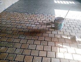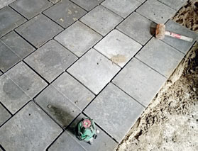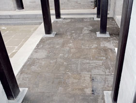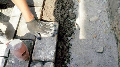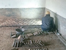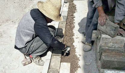 ❺ 上缝 ——在砖的里口砖棱处抹油灰,用橡皮锤敲击砖面,把砖按原位重新墁好