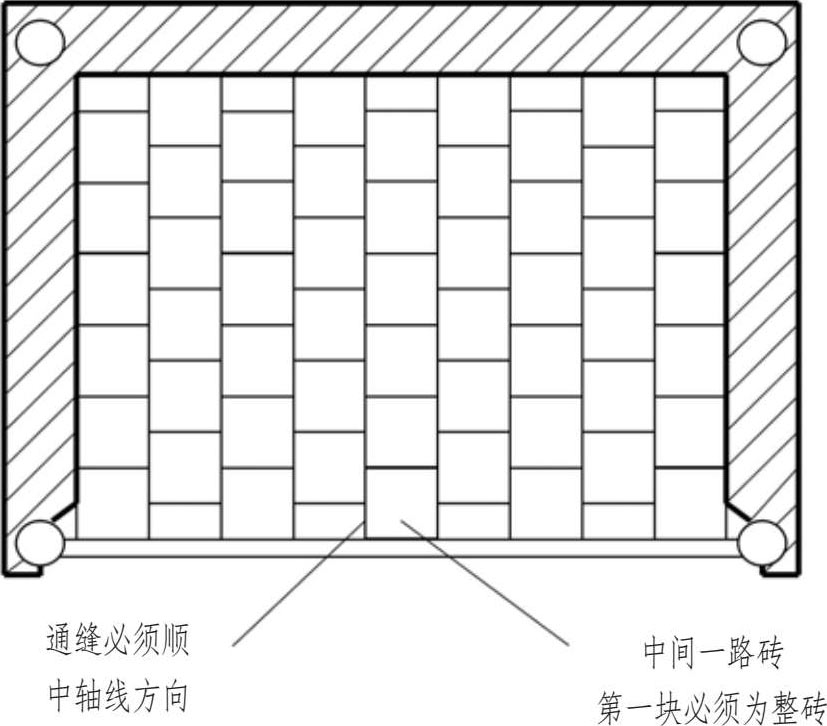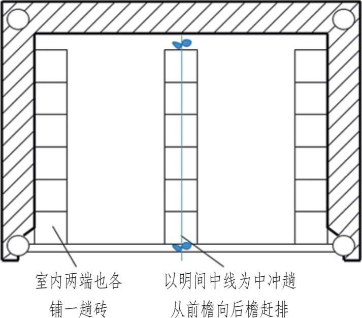 冲趟是在大面积墁地开始前先墁好几趟砖,作为后续墁地的标准和依据。室内地面以明间中线为中冲趟,从前檐墁起向后檐赶排,室内两端也应各铺一趟砖,见图 1-21。