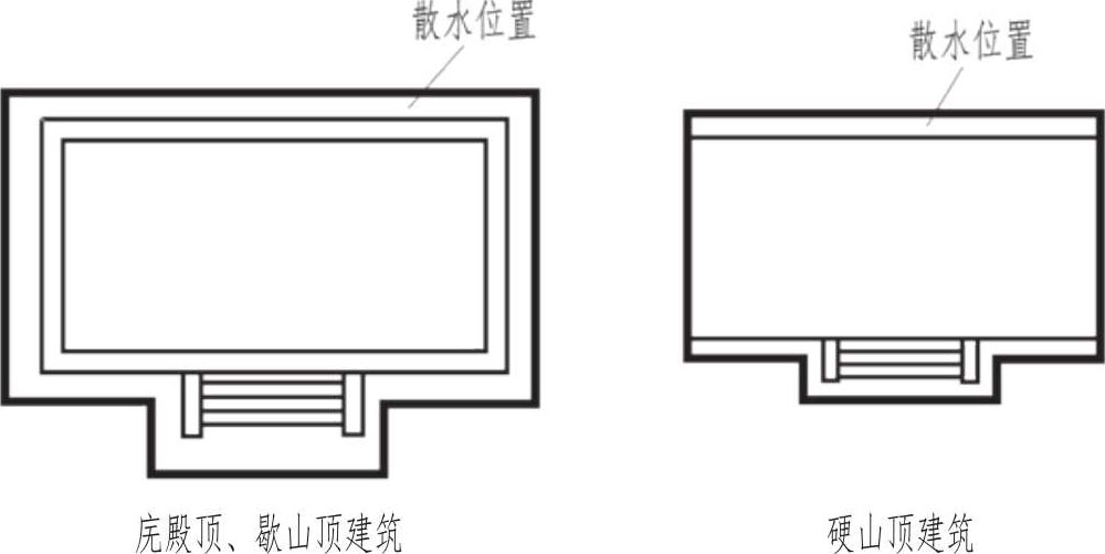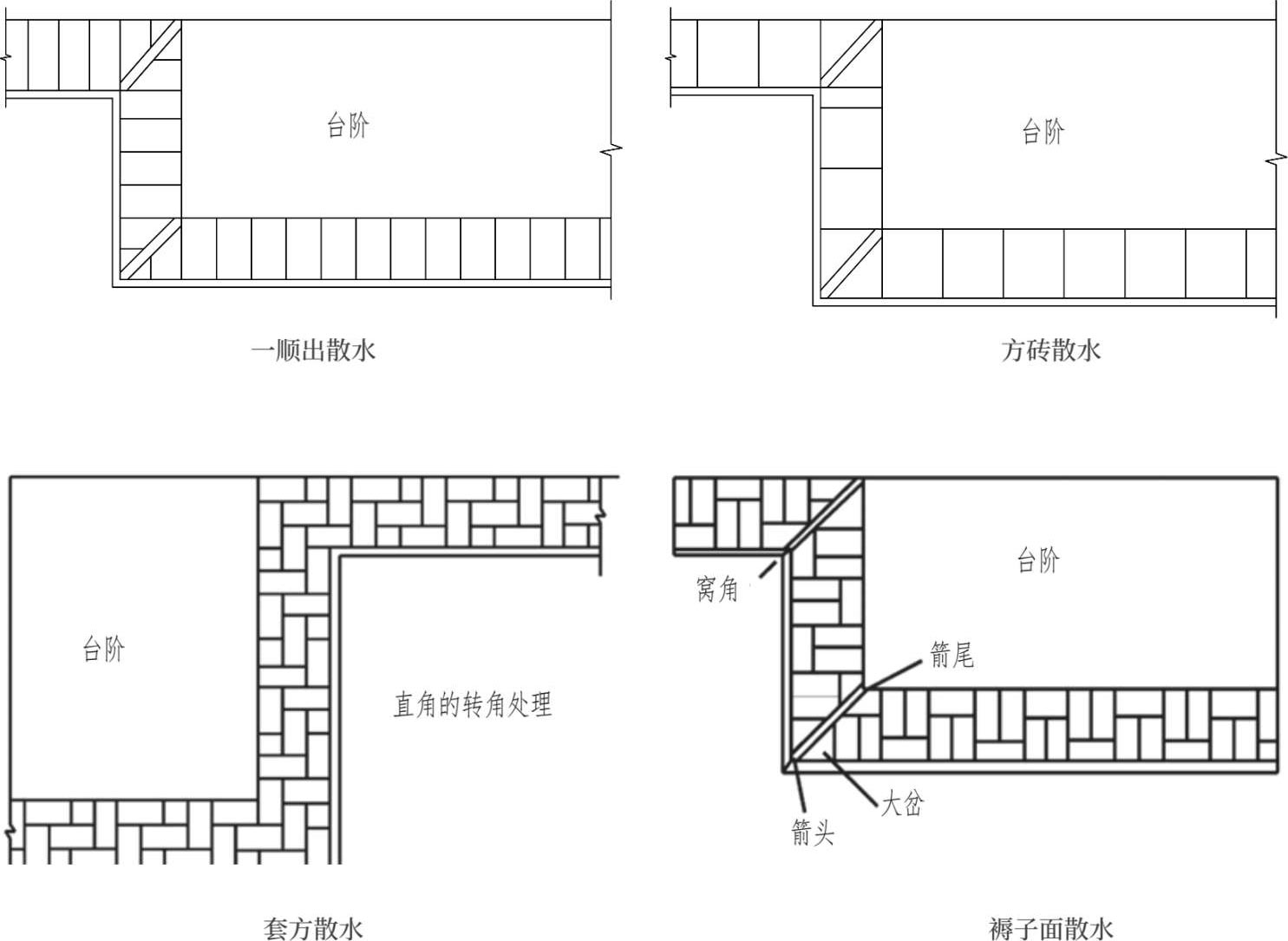 古建筑房屋周围散水的位置处于硬山顶、悬山顶建筑前后,或处于庑殿顶、歇山顶建筑四面,详见图 1-22。