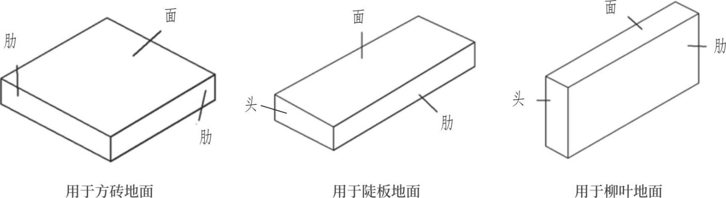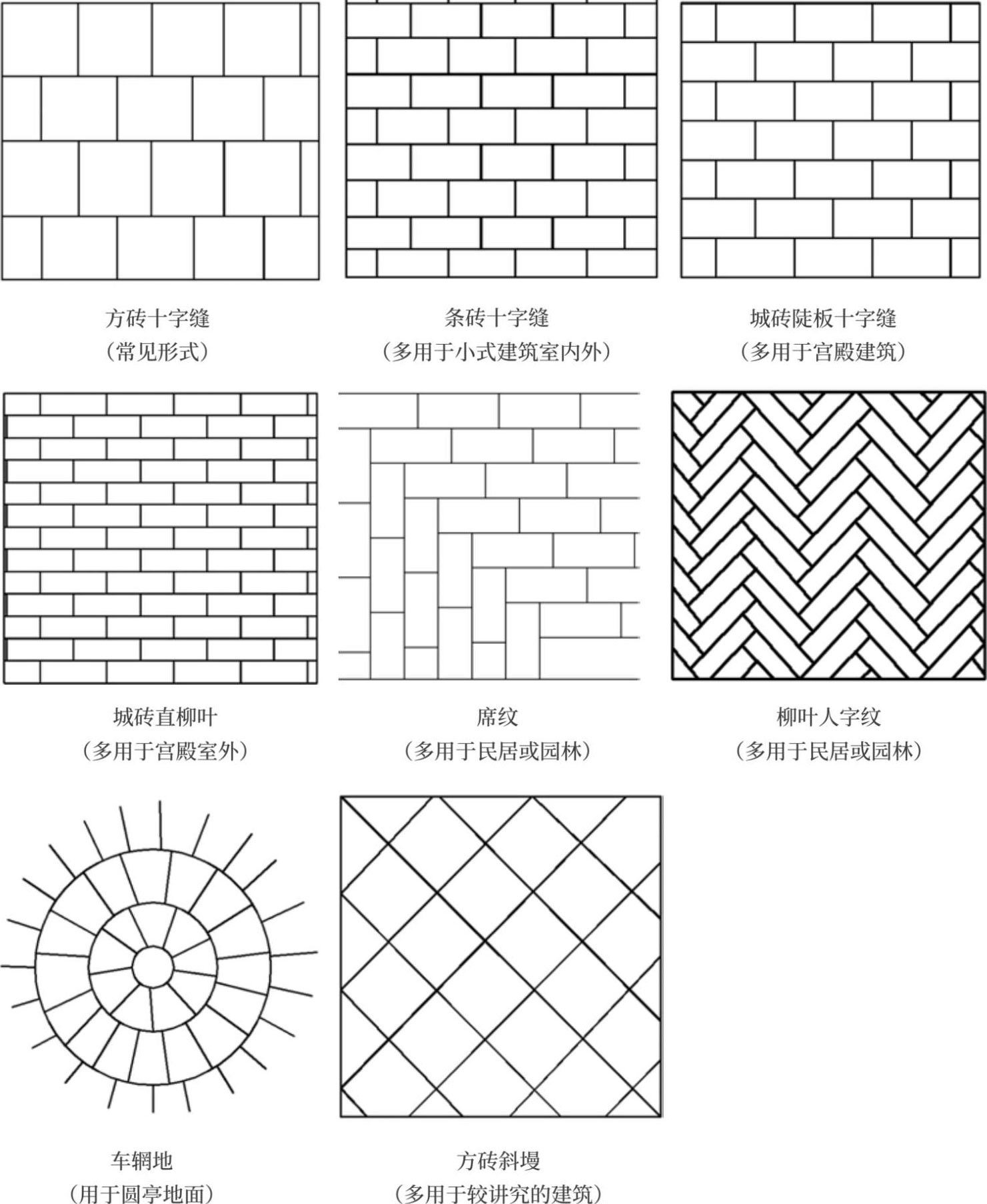 砖墁地面包括条砖和方砖两类,条砖包括大面朝上的陡板地和小面朝上的柳叶地;方砖包括尺二方砖地面、尺四方砖地面、尺七方砖地面和金砖地面等。常见地面砖的排砖方式见图 1-16。