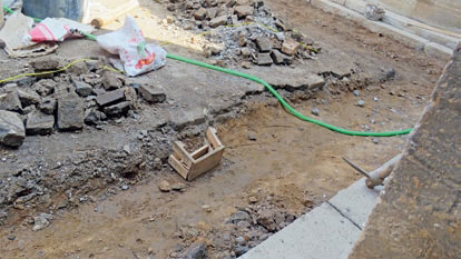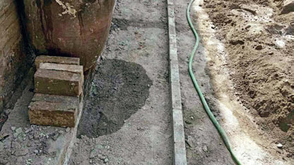 ❶ 测量放线 ——散水宽度以能使檐口落水在散水上为准,散水里口与台明土衬石找平,外口按室外地坪找平