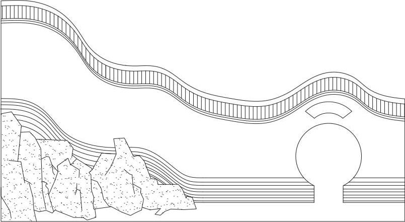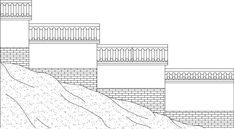根据墙体立面形式分类,有云墙、花墙、迭落墙、爬山墙等类型(图 2-2)。云墙常用于园林建筑之中,墙体顶部呈波浪形起伏变化。花墙是用砖或瓦摆砌成透空图案的墙体。迭落墙与爬山墙常用于地形有起伏变化的山地建筑群中,墙顶部断开为迭落墙;若墙顶不断开,随地势上升,则称为爬山墙。