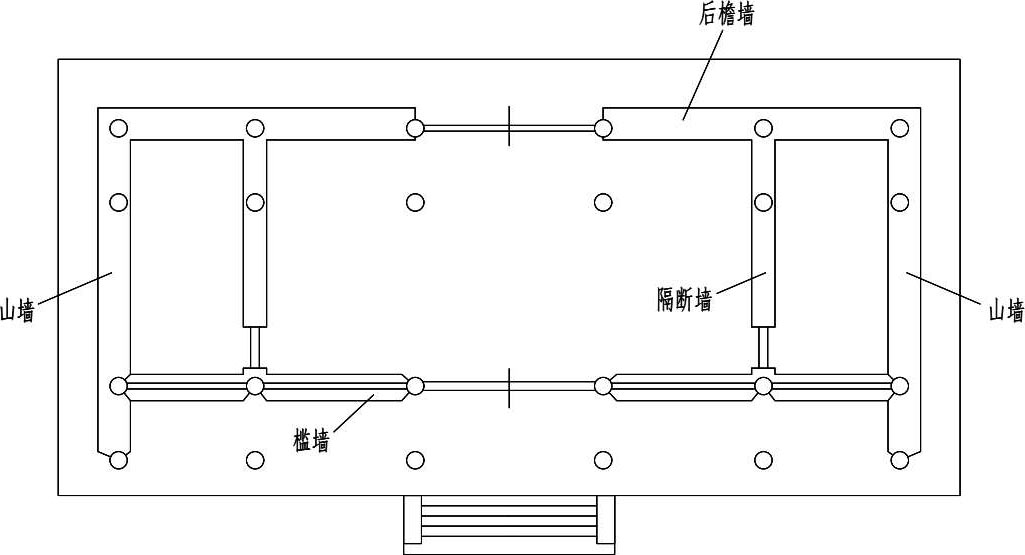 按照墙体在建筑中的位置分类,有山墙、檐墙、槛墙、隔断墙等类型(图 2-1)。山墙是位于建筑物两端位置的围护墙。檐墙位于檐檩之下,是柱与柱之间的围护墙。槛墙是位于建筑前檐或后檐槛窗踏板之下的墙体。隔断墙是位于室内分割空间的墙体。